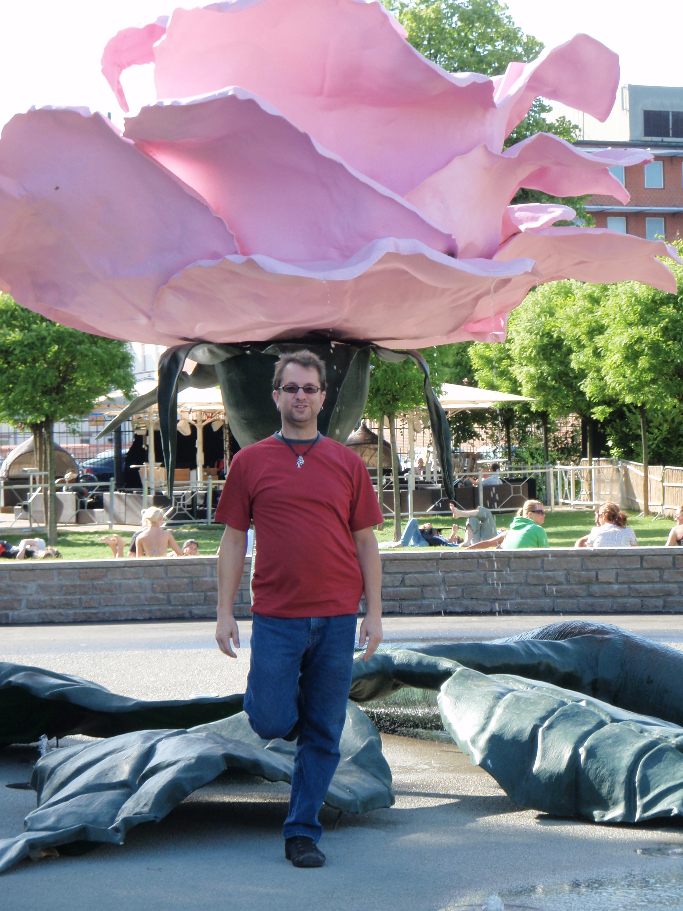 My Host, Malin. This morning we worked on designing a magic trick involving an appearing goldfish. Then there’s me, on the highest ferris wheel in Scandinavia. In the background is The Twisting Torso, the highest building in Sweden. Hopefully I’ll have better pictures soon, when I get down to the waterfront to really see it. And finally, here’s a picture of a statue of a marzipan rose. It’s in the same park as the ferris wheel.