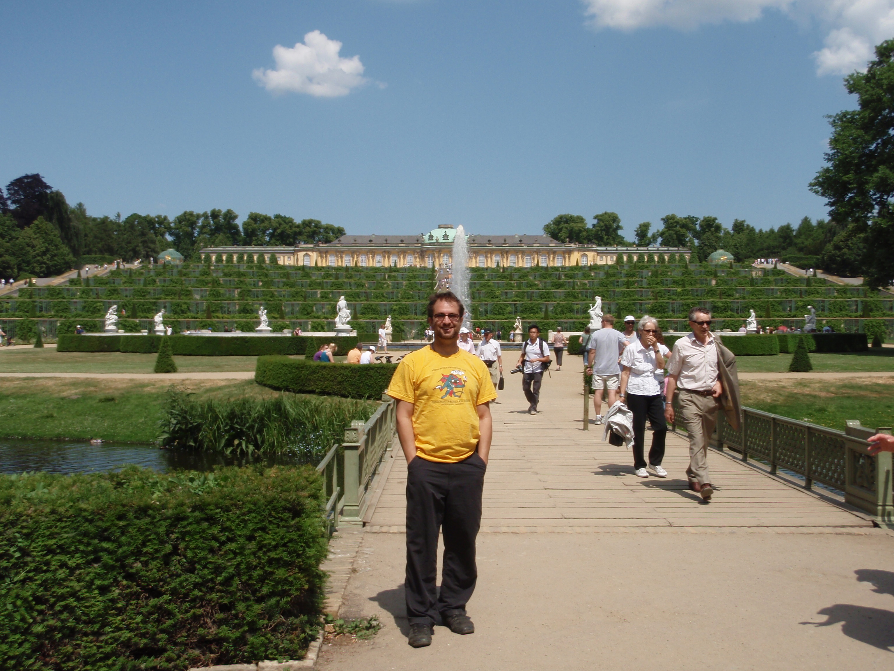 When we last left our intrepid explorer, he was thinking of taking a walking tour of the city on Sunday morning. And honestly, that was his intent when he went out to the McDonald’s to meet the tour group. However, instead of talking the “Original Famous Walk“, I got talked into taking the Potsdam Palace walk. Potsdam, referred to by our tour guide Lauren (that’s her in the big, red hat), is like Disneyland for the royals. In actuality, it was a huge area of land used by the various Prussian monarchs for their palaces. It was something else. Huge gardens and fountains and vineyards, oh my!