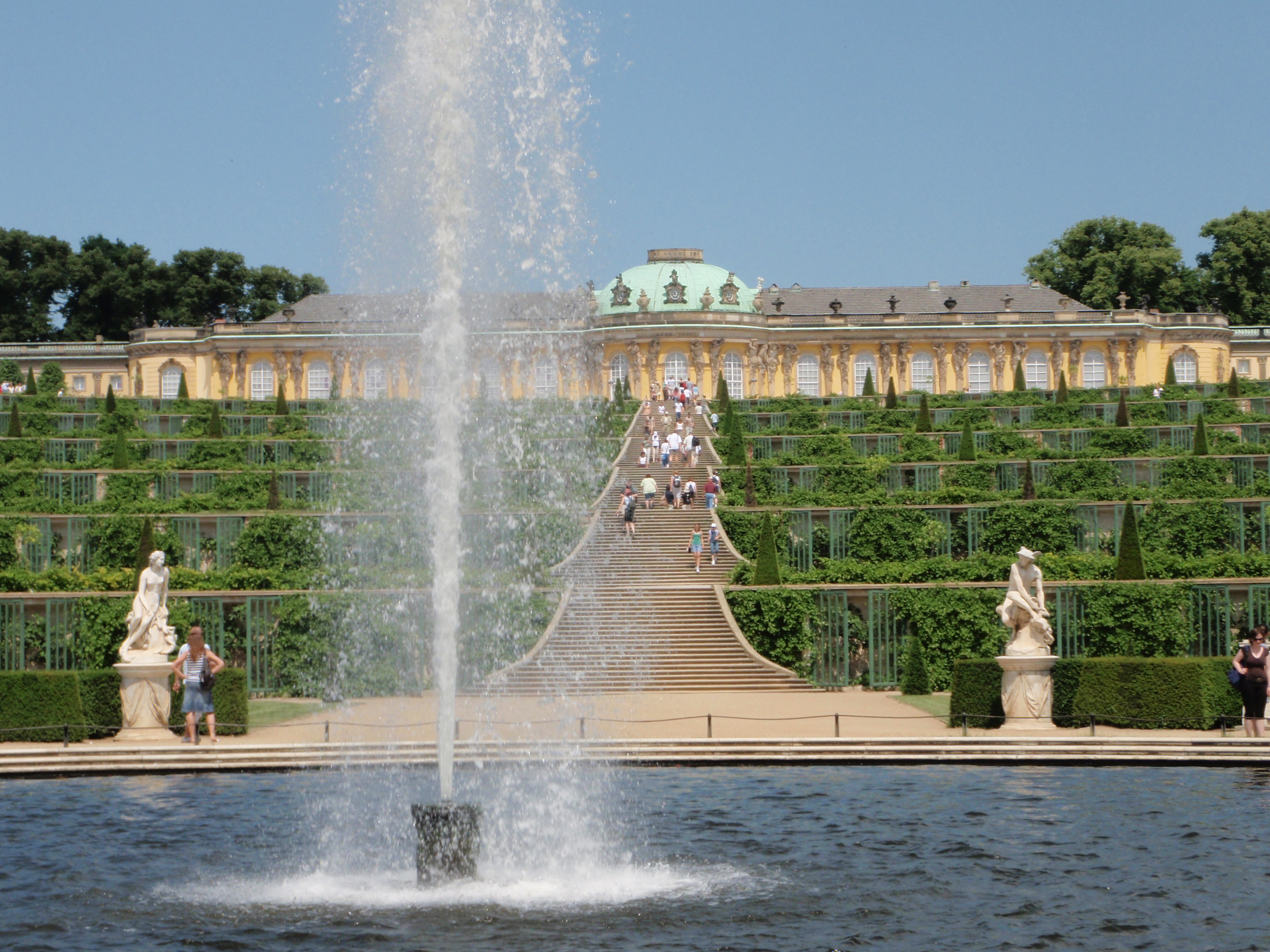 The first palace you come to is the biggie, the one the whole area is named for – Sans Souci. Evidently, it’s the one on all the post cards. There’s a long, garden lined walk, which leads up to a huge fountain with Koi in the surrounding pond. Further up from there is the vineyards and orchards, done in a steppe formation so Kaiser Friedrich the second (I think that’s right, there were a lot of them) could ride his horse by and just grab a piece of fruit. Pretty stunning area.