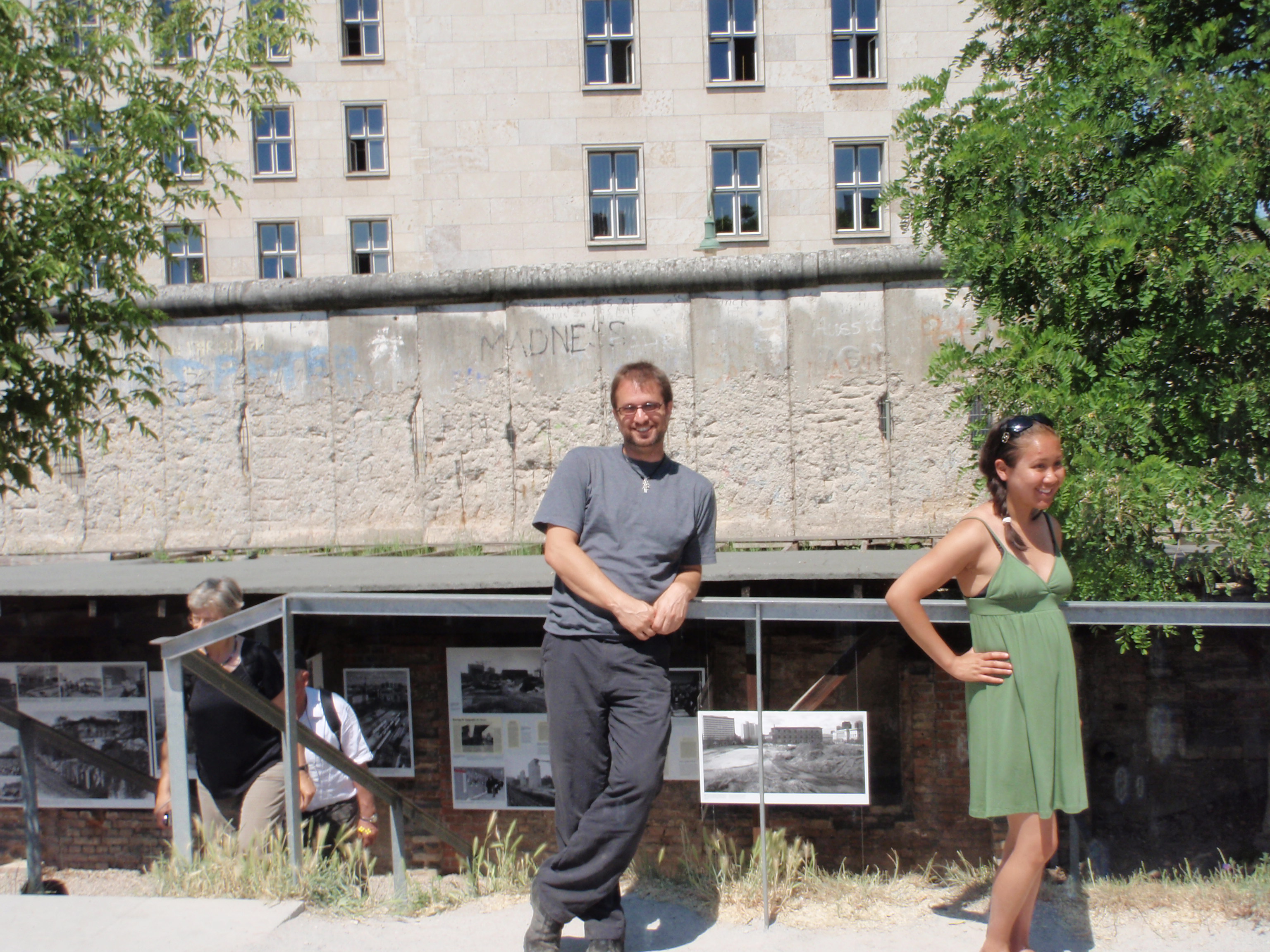 The next day was time to actually take the Famous Walking Tour! Got up and headed down to McDonald’s for the 10am rendezvous and met Kenny, our Scottish tour guide. This was the tour to really introduce the city and it was well worth it! Kenny gave us background on the city itself, we hit a lot of the major tourist sites and learned a fair bit about the war and the divided city. Honestly, Berlin is amazing in what it has contributed to Western culture over the last 160+ years. Not counting the obvious, evil stuff, there’s a university here which has produced 27 Nobel prize winners, where Einstein taught and first presented his Theory of Relativity and where Marx came up with his original ideas of communism when he was a student there! And it’s right across the street from the plaza where the Nazis gathered the works of 350 writers (about 20,000 volumes in all) and burned them. The monument, shown here with one of my infamous shadow self portraits, is a room under the ground, filled with enough empty bookshelves to hold all 20,000 books which are missing. That particular plaza was well chosen since on one side was the University’s library and the other has a world class opera house where Albert Speer hosted an end of war party. They were playing music while the guns of the Russian army could be heard 30 miles away. At the end of the concert (for high ranking Nazi officials and sympathizers) he had little Hitler youth handing out cyanide capsules. Hell of a guy! It’s actually rather interesting, to see the dichotomy of people when trying to promote their city and denounce the bombings which took place and how wrong that was against the atrocities of Hitler and the Nazi regime. For instance, the tour makes a stop at Hitler’s bunker, but takes great pains to point out that now it’s a car park and there’s nothing to memorialize it save a poster showing how it was laid out.