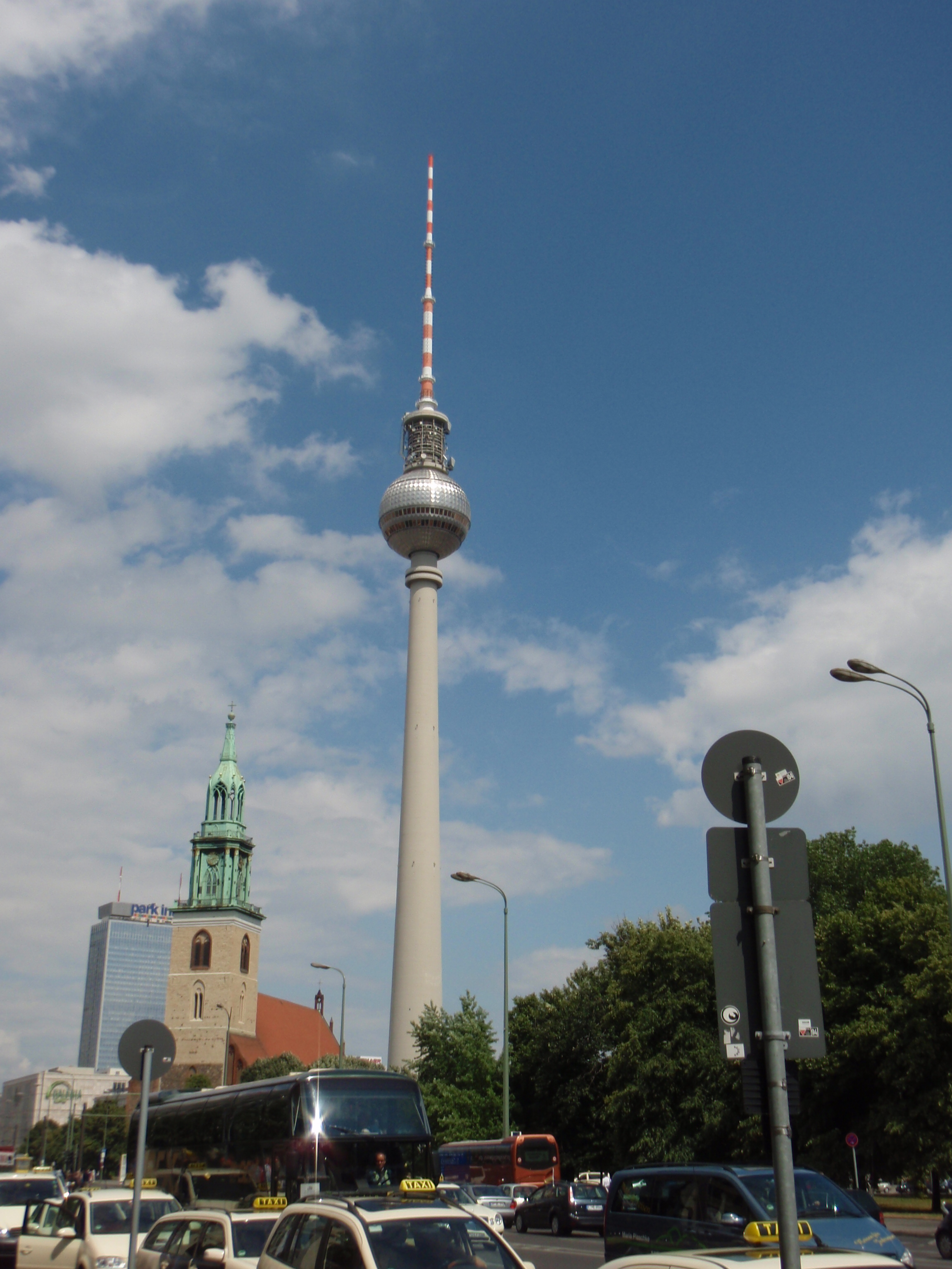 From Saturn, Bec, the Australian tourist, and I went to the TV Tower. It’s one of the tallest structures in Europe with an observation deck and a rotating restaurant. It really dominates the skyline. Built in the 60s or 70s it was a huge piece of propaganda for the East Germans. They wanted to show off their technology. To do this, though, they had the Swedes help them. The Swedes did something rather ironic in the construction, however – See, when the communists came to power in the divided city, they had all the crosses cut down off all the churches. What they didn’t count on is what’s become known as “The Pope’s Revenge” on the ball of the tower. When the sunlight hits it, the prismatic facing splits the bean into a