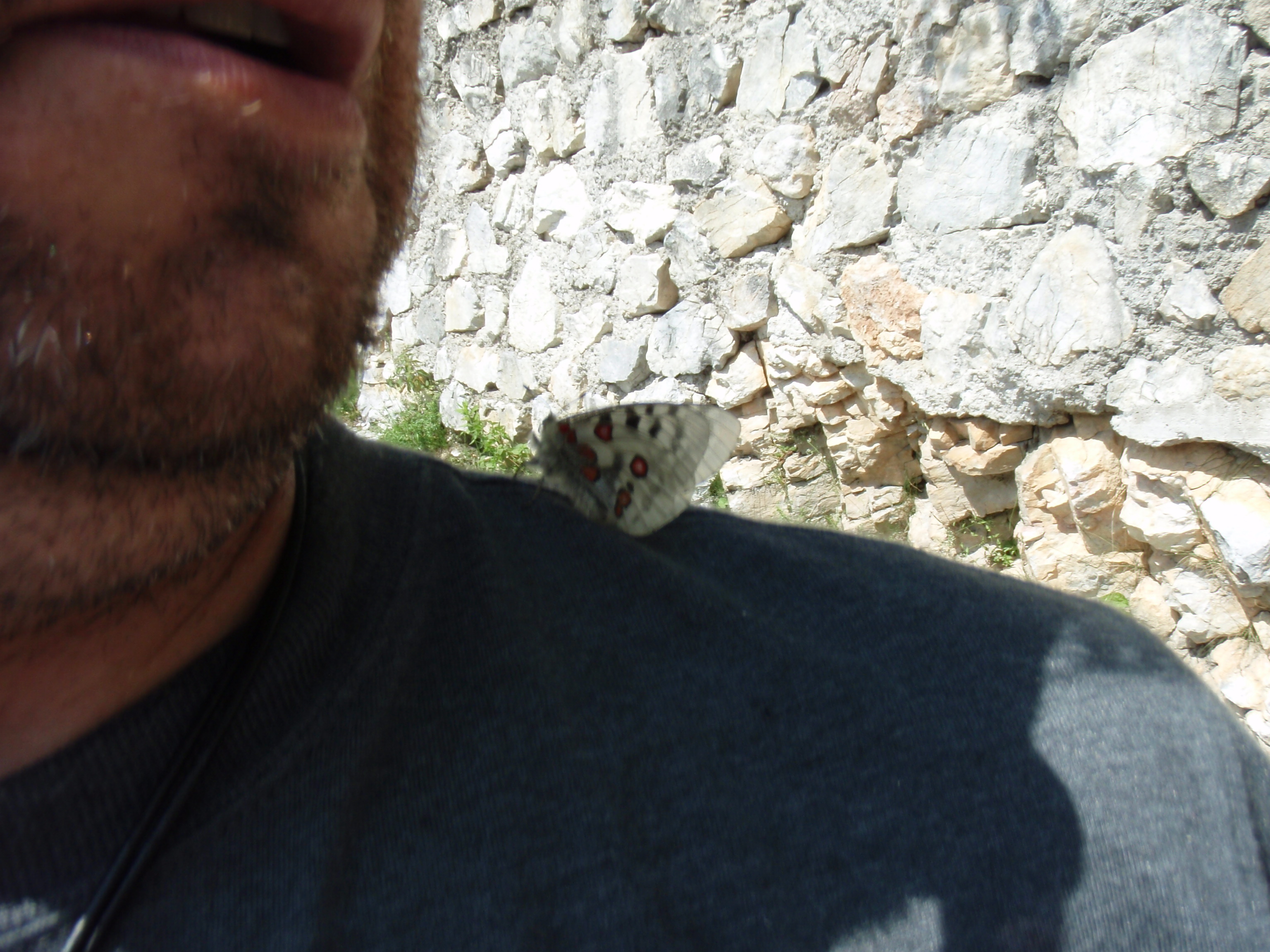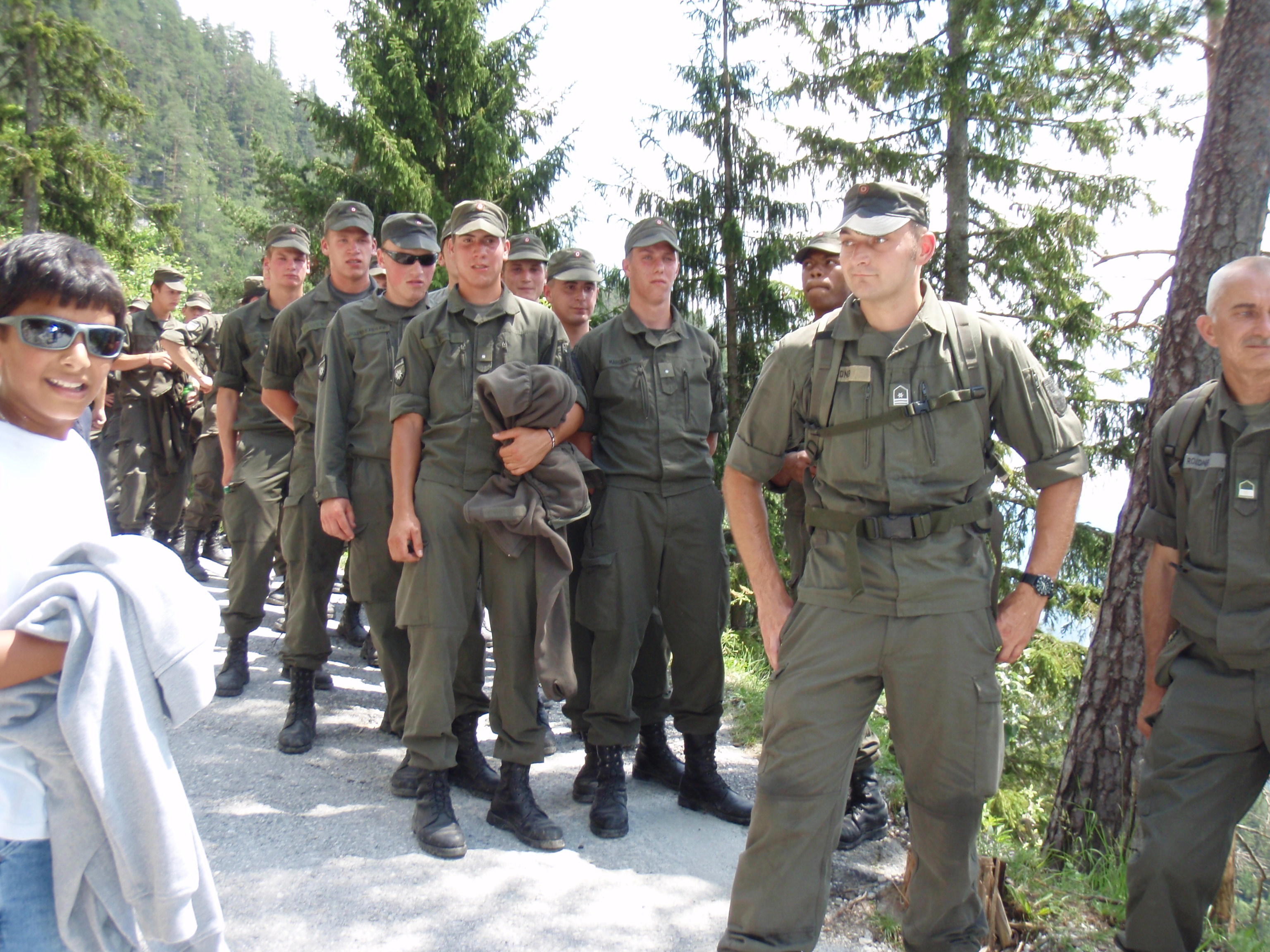 march down the way we had just come. I asked permission before snapping a few pictures and we all made some jokes. (One soldier, when questioned as to what kind of a unit they were responded simply, yet shrilly, “We’re in the army NOW!” We all laughed.) One of the soldiers then pointed at me, indicating my shoulder. I had no idea what he was talking about until I looked down and saw I had picked up a hitchhiker – a little butterfly had landed on me and decided it was tired of flying. It stayed with me for a good hundred