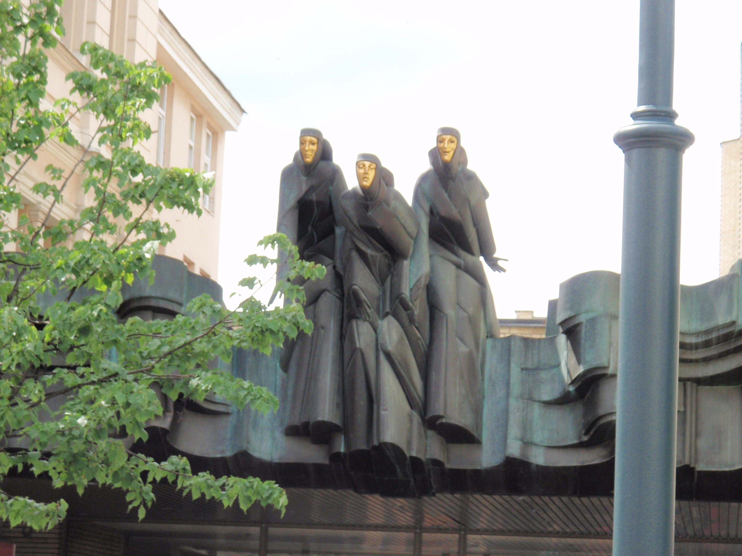 passing by the national theatre for the second time. This time, though, I had to snap a picture of the sculpture which over looked the entrance. Just amazing in its power and majesty. Further on and we made it to the remaining tower of the castle on the hill in the middle of town. Again with the stairs to get up,