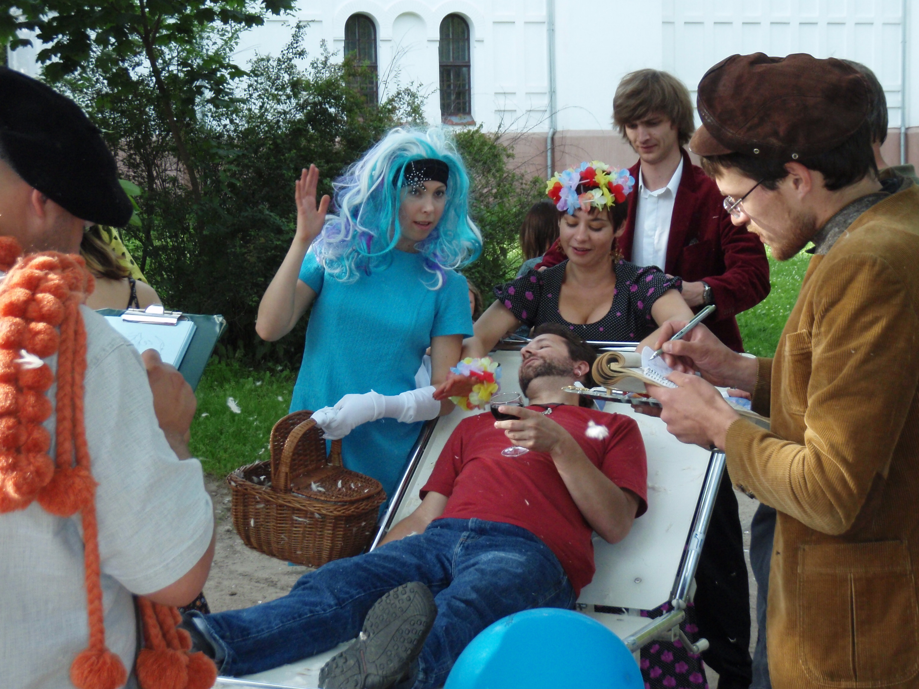 Just before we crossed the bridge over the stream (which was covered in Padlocks, which are put there by couples, engraved with both their names – a cool tradition I think) we see a troupe of performance artists, about a dozen or so, singing and dancing around a man on a gurney. Before we can ask what’s going on (or get out of harm’s way) the guy on the gurney is replaced by, you guessed it, me. There are people singing, throwing chicken feathers,