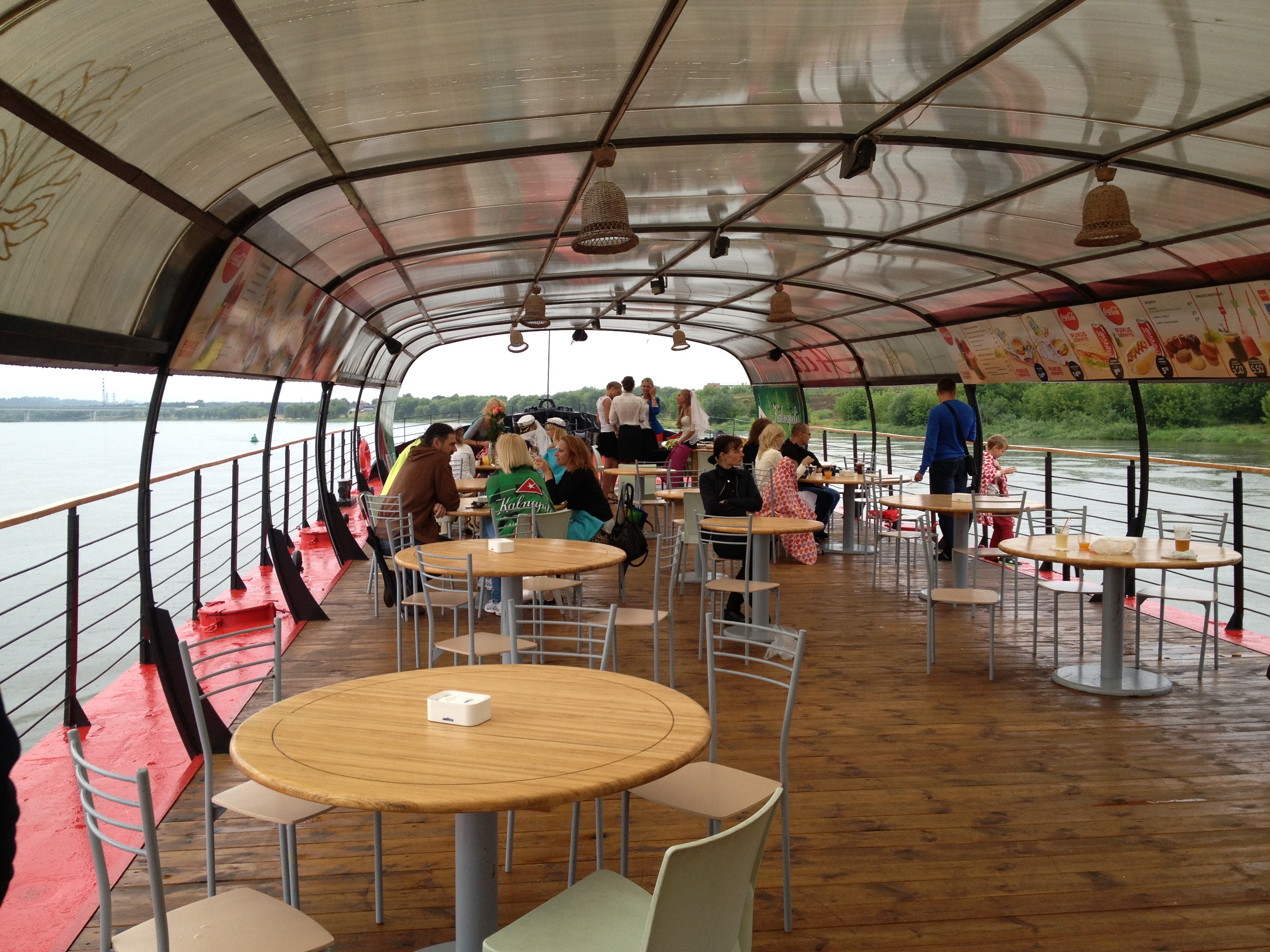 and Austeja and taking the river cruise down the Nemunas. I will say, this was my idea. I’d been seeing the long, repurposed cargo boat for two summers now and thought a nice lunch cruise would be fun. I assumed that since the boat was sponsored by a local restaurant chain specializing in Lithuanian food, and the boat had tables and chairs, there would be some sort of local cuisine and, according to the website, a bit of information on Kaunas and environs. Sadly, it was neither. The fee for the boat was strictly for the boat and there was a counter serving not great hot dogs, hamburgers and panini and the two-hour ride, down and back up the river, was accompanied by first, a soundtrack of reggae inspired cover tunes and then a Joe Cocker CD. Not exactly the audio we were looking for, but we had a good time anyway, laughing a lot, despite the rain and alligators.