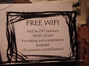 Except we couldn’t. The hostel manager, who had already set aside an enclosed room for TV watching with a sign which instructed that computers and phones were NOT allowed, also unilaterally declared that the wifi would be turned off nightly between 7 and 10pm to ” For eating and conversation purposes (to prevent zombification).” This is an admirable idea, no doubt. And certainly setting aside a room where you ban Internet is fine. But this causes two problems for me. 1) it means you’re lying in your advertisements about free wifi if you don’t specify the rules and 2) who are you to tell me when I need to socialize and eat and that if I don’t do so, there is something wrong with me? There were a number of people who were sitting downstairs, not talking to anyone mind you, waiting for the 10pm turn on so they could make travel plans for the following day, consult bank balances to pay bills or check in with their children half a world away. And of course, it wasn’t always exactly at 10pm. One night, the Internet didn’t return until almost 11 and even then, it was spotty at best. Absolutely unacceptable.