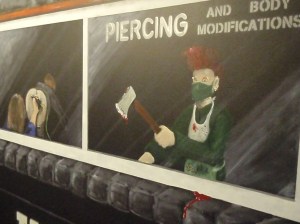 Books Excellent for burningUpon our return, when we actually had the opportunity to check in, things began to go slightly askew. The place is, indeed, a converted church. But rather than make any use of this architecture, it felt like the 70s when offices would move into listed buildings and slap up acoustic ceiling tiles and cubicle partitions and lose any charm or personality the building itself had. Here, it was even worse. The paintings along the corridors were designed to resemble a run down neighborhood high street with a bookstore that offered the advice “Excellent for Burning,” a Ted style bear mooning you (furry hands spreading hairy cheeks), and a tattoo/body modification shop featuring a mohawked woman wielding a bloody ax. Even if your idea of humour lends itself to laughing at films like Hostel, this really isn’t an inviting atmosphere for anything.