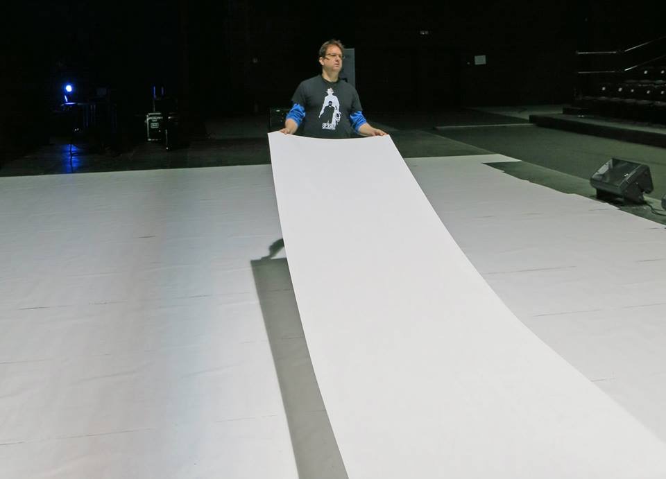 making a 30 meter screen out of a roll of paper. This was an interesting experience. I was used to walking around barefoot on scrim paper (thanks Richard Faverty) but I’d never made a screen before. And since I’d watched the video of the show a few times, I knew this screen would get thoroughly destroyed before the night was over. After the 45 minutes or so of building it, I was kinda glad they were only doing one show, otherwise we would have spent all day making these. The end result was amazing though. It looks seamless and is well worth the effort.