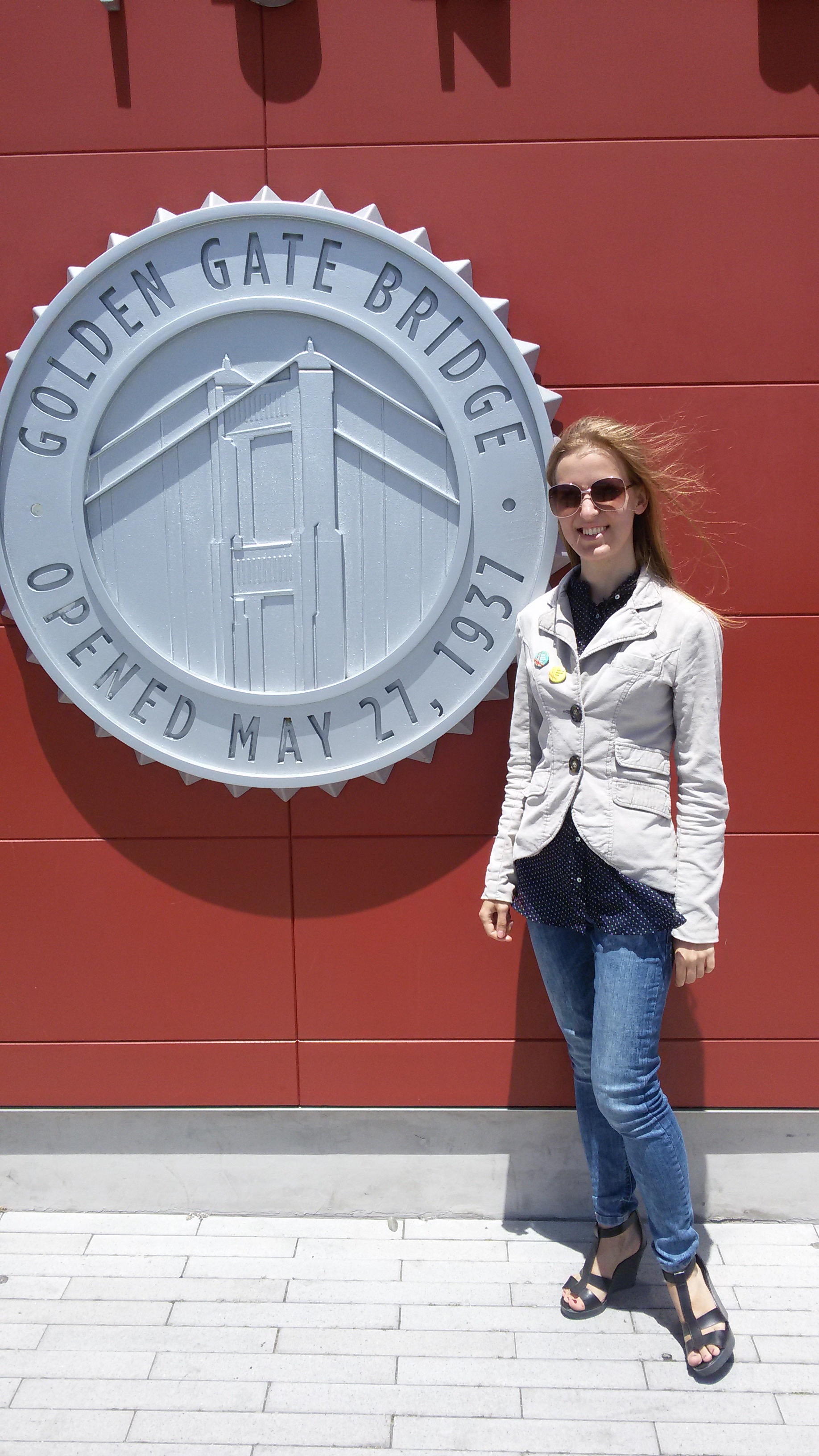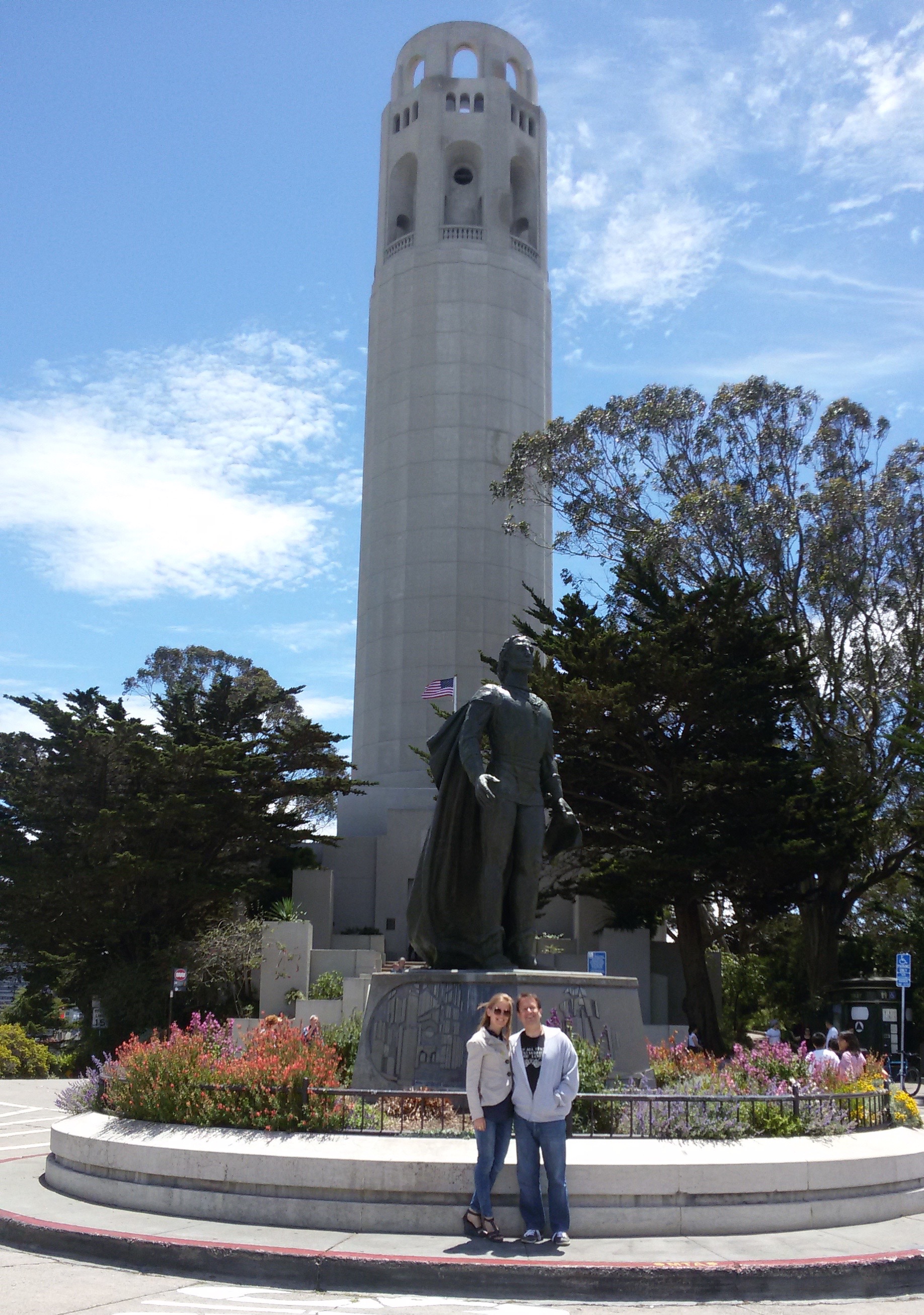 Francisco before, I’d never walked the span, so this was something new for me. It was a blast (and not just from the chilly wind coming in from the ocean side). When we got to the opposite end, I insisted we get buttons reading “I walked the Bridge” (Rasa not so much with the souvenirs) and then, meeting up again with AAron and Kirsten, we headed off to another attraction I’d never seen, Coit Tower. Naturally, we went via Lombard Street, the crookedest street in the world!