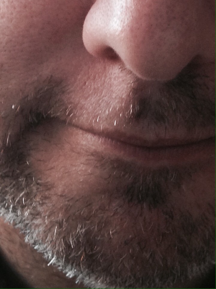 So about a month ago, I get out of the shower and take a look at my face. This isn’t all that unusual, most of us do it (take a look at our own faces, if you’re looking at my face that might be unusual). Anyway, I notice that while I’m in need of a shave, there’s a weird patch of… nothing, just under my right nostril (see picture).