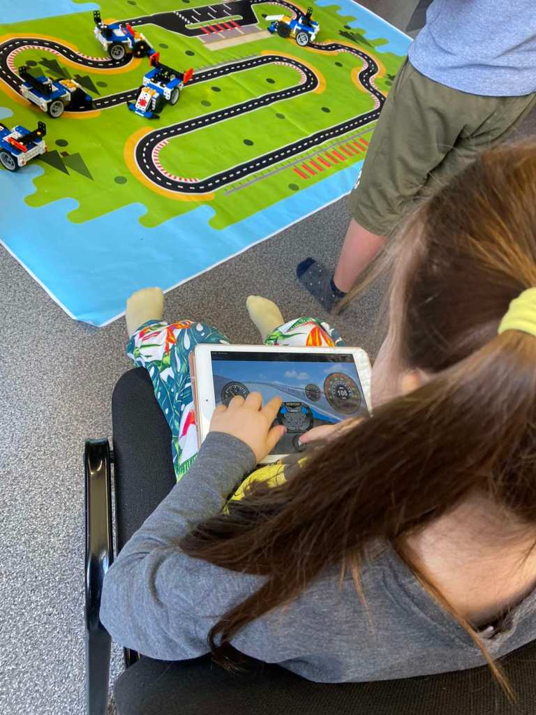When that was done, the next thing was what, I think, she was most excited about. We built a “robot” car, which, when it was finished, could be controlled by an iPad app. For her, it was similar to building LEGO, following “constructions” to get it all together. The difference here was that instead of bricks, which connected to each other, the pieces in this particular kit used “rivets,” connector pieces that snapped through holes to attach the pieces together. Sometimes, when the pieces wouldn’t connect easily, I noticed that her frustration levels were a bit high. If she couldn’t get something on the first try, she would get angry and we’d have to stop and have a chat to talk about her attitudes and how she just needed to focus to do it properly.