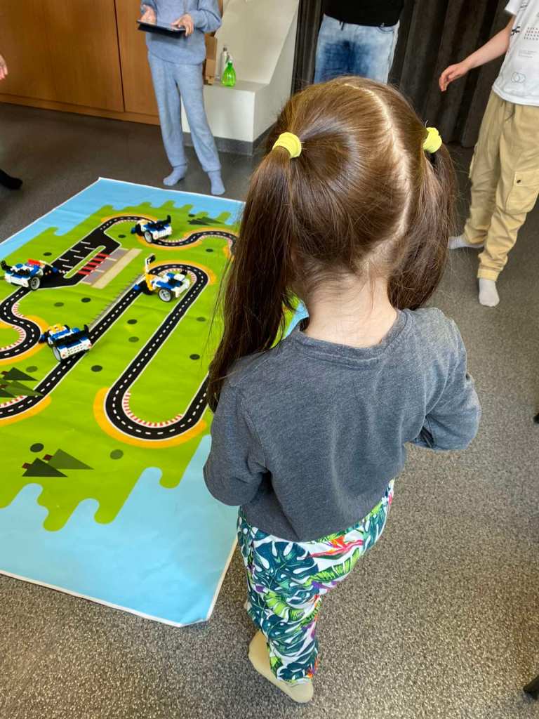 We did finish, finally (and not last) and were able to connect our car with the app to drive it around the track which had been laid out on the ground. After playing for a few minutes, there was a short race, where all of the cars lined up and had to go in a straight line a short distance, turn around, and go back to the start. Not very complicated but again, Monki’s frustration levels got a workout. When another car would bump into hers (the controls weren’t very sensitive and were also a bit backwards) she would complain about how they “made her lose.” Losing is a very big deal for her at the moment. When we play games at home, she always has the choice to play by the real rules or by “Monki Rules.” Monki Rules being the ones which let her win. She knows they’re not the real rules and not how you play the game, but at this point, winning is more important for her. I figure we have until she’s 6, in July, to let this continue. There are a number of behaviors in her life which she has designated as changing when she turns 6. I think, for her, 6 is a demarcation point. She’s already lost her first tooth, a definite rite of passage, but 6 is when she starts to feel like a grown-up. That’s when she starts first grade, when a number of age-restricted games and toys become available to her, and when she feels like she can do things by herself. I look forward to 6, too.