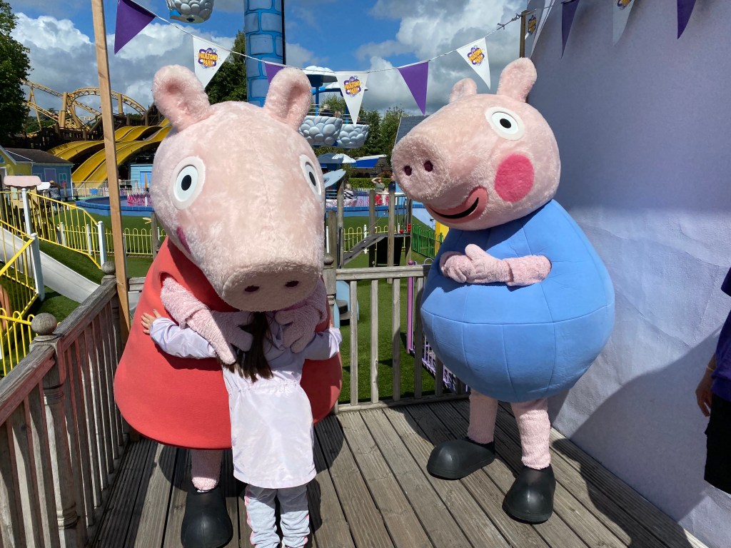 As is common with almost all modern amusement parks, Paultons is divided into various “lands” or, in this case, “Themed Worlds,” amongst which Peppa Pig is only one. But for us it was the most important. As we entered the land, we immediately passed a notice board which listed the meet and greet times for Peppa and George (her little brother). The first was at 10:30, quite soon. As good parents, Rasa and I did the “divide and conquer” dance, with me taking Monki on her first ride of the day while Rasa got into the queue for pictures.