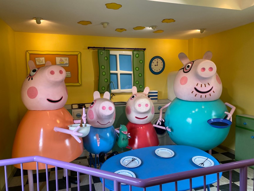 Pictures in camera, and, looking back at the line of people who would follow us for the meet and greet, happy we had done it early, we were free to explore the remaining sights and sounds of Peppa Pig World. Next up was Peppa’s Big Balloon Ride, a simple in-air spinning ride. This was followed by Miss Rabbit’s Helicopter Flight, a helicopter themed Ferris Wheel. All of these rides are based on various episodes of the show and Miss Rabbit flying a helicopter is a pretty big deal. In fact, Miss Rabbit does a lot of things, so many that they’ve written a whole song about it.