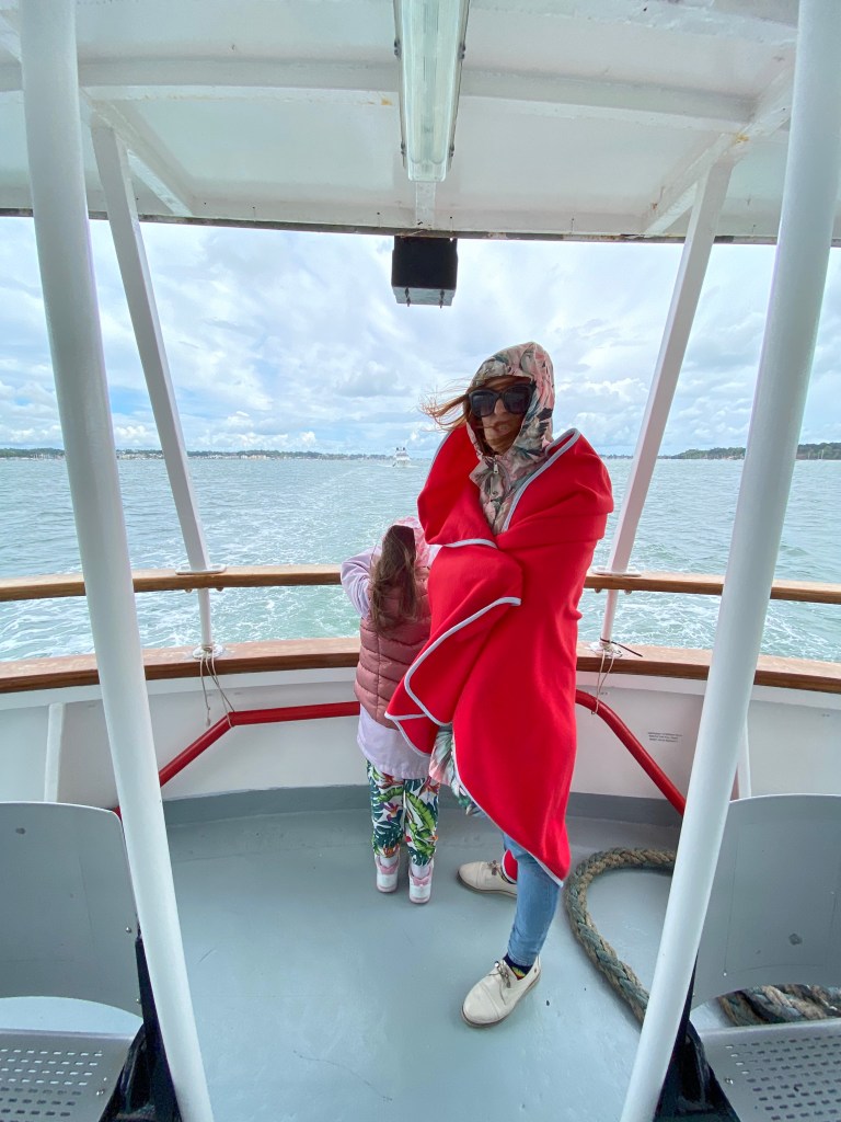 Now that we were set for warmth, we headed back to the boat, the Solent Scene. This boat had two outdoor seating areas, an indoor deck with seating along the edges and a downstairs café, which opened as soon as we got underway. And as soon as we were underway, I was down there getting my girls hot beverages. When I returned with Rasa’s latte, though, I could tell she was angry about something.