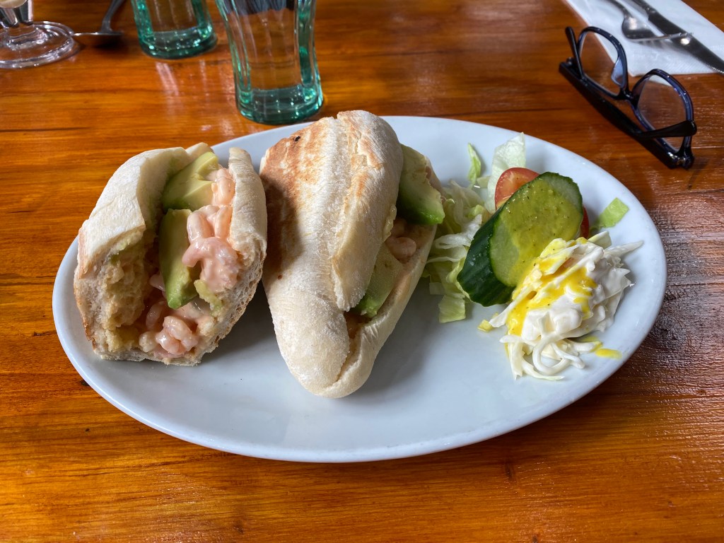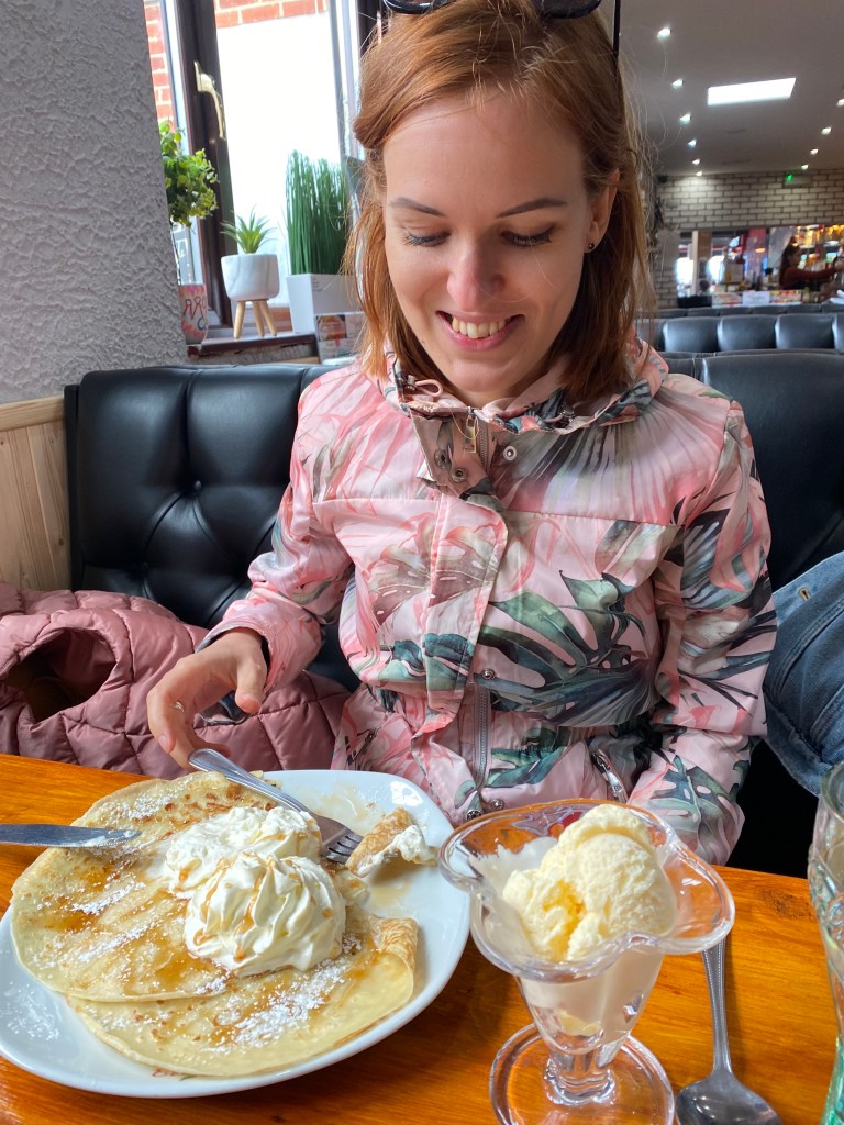 Returning to Poole, we still had time before we needed to head to Bournemouth to meet with Dai, so we put lunch on the agenda. We found a nice little place called Aroma Café, which had “American Style” Pancakes on the menu. Rasa ordered those. What came was more like crepes, but it was all tasty so no worries.