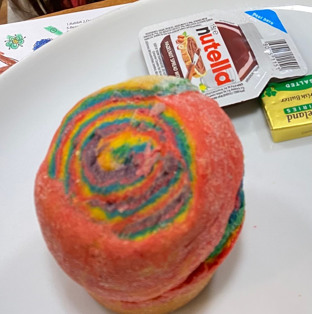 We stumbled across a café called The Greenwood Tree Cafe which looked promising. The first thing Rasa noticed on the menu was “American-style” pancakes. Noting our slight disappointment the day before, I asked what that meant. Our server explained it was the big, fluffy pancakes we were looking for, so Rasa and I both ordered that. Monki, meanwhile, was ordering off the kids’ menu (naturally). On that menu was something called a “Rainbow Scone.” We kinda figured we had to order it.