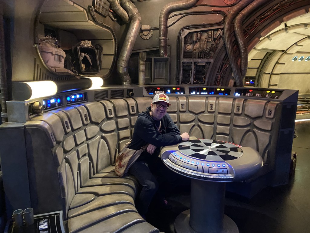 After successfully fending off the Empire, still on Batuu, we figured that flying in the Millennium Falcon was our next choice. Again, the line was overestimated and there weren’t many people anyway, so we just went for it. In this ride, groups of six are brought in to fly the Falcon on a “Smuggler’s Run,” with pairs assigned to pilot, shoot, and repair the ship as you go through the ride. Troy and I got to be pilots, which, to be fair, is really the best job. Before you get into the cockpit, though, you get to spend time in the Falcon herself. It is SO cool. If someone had told 9 year old me I would one day be sitting in the same place Chewbacca and C-3PO played chess, I would have laughed at them. Yet here I was.