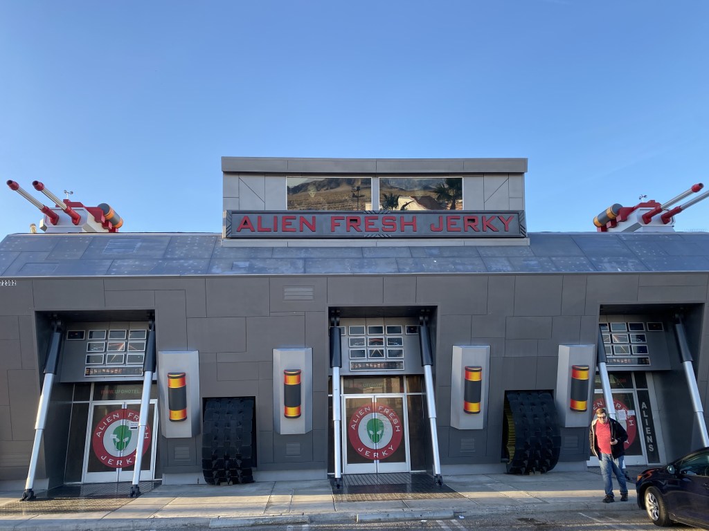 Taking our leave, we headed back towards Vegas, stopping again in Victorville to have a coffee with Jennifer and were joined by her friend Isaac, an actor who had spent time with a theatre troupe near where Troy lives in Arizona. Naturally, the talk centered around travel and theatre and all sorts of cool things like that. When the car was charged up, we said our goodbyes and continued our journey. In a reverse of the start of the trip, we again stopped in Baker, but this time we walked down to Alien Fresh Jerky, a shop that started as a roadside stand selling dried meats and was now a tourist destination and building a hotel in what was ostensibly a ghost town.