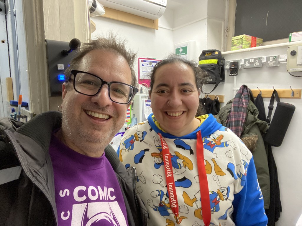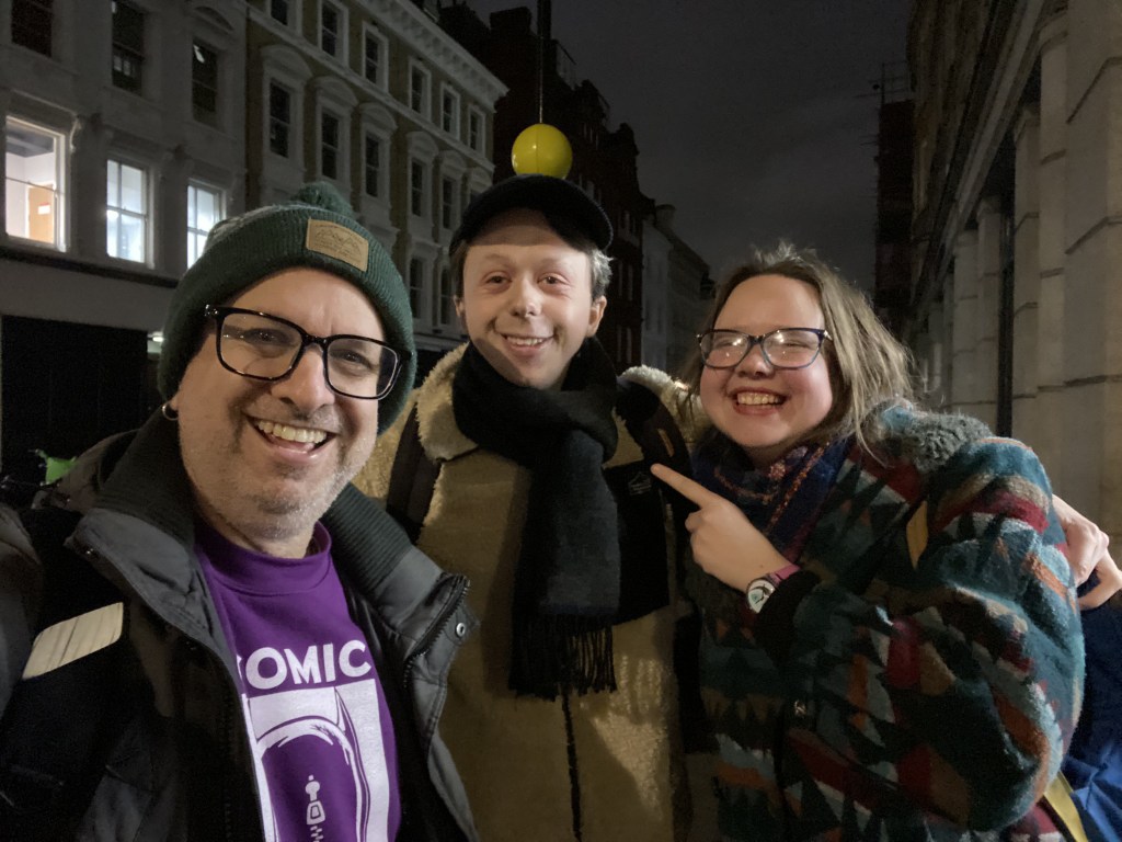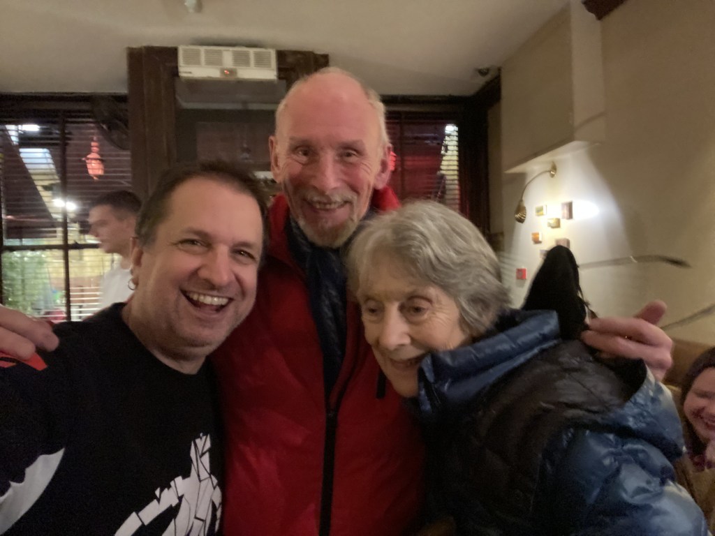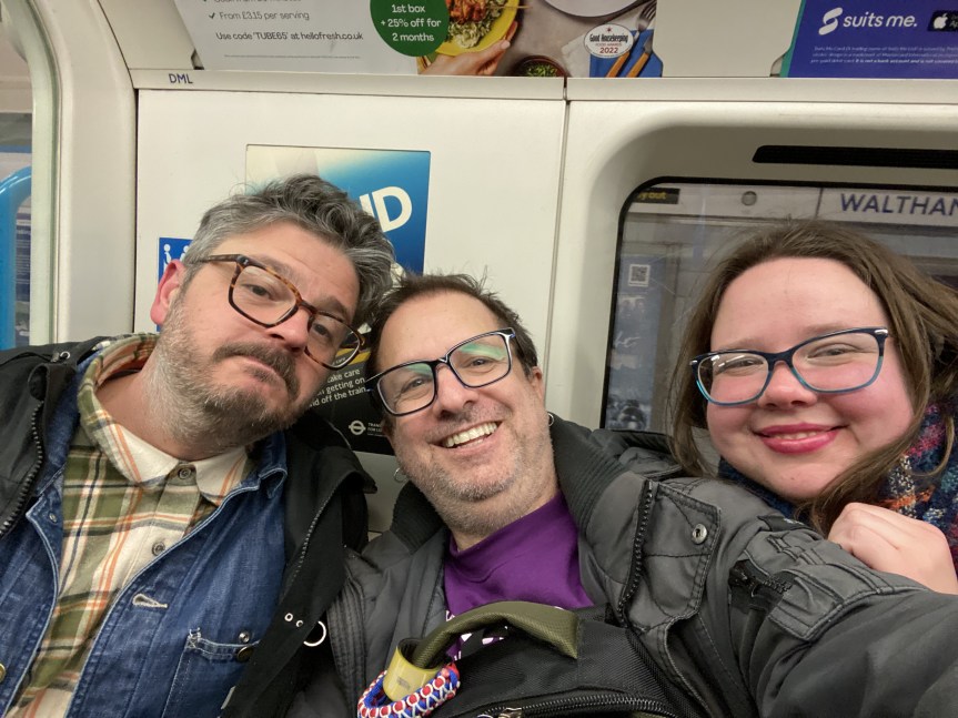 We made it, barely, but then, sitting across from us were two people, rather obviously inebriated, who were sharing a beer and struck up a conversation with us. Turns out the girl, Lara, was Estonian so when we mentioned Lithuania, she opened up even more. Her companion on the ride (not her date) was Simon, who was from Nottingham. Turned out they both worked at Camden Arts Center and there had been a big opening that night. Our conversation bounced between talking about the war in Ukraine to Lara (who was a community person) asking Simon (who ran the snack bar) to save her a salmon bagel in the morning. It was the perfect late-night encounter, made better by the fact that Simon now also lived in Walthamstow so we rode with him the entire way home (and got a picture before we parted company).