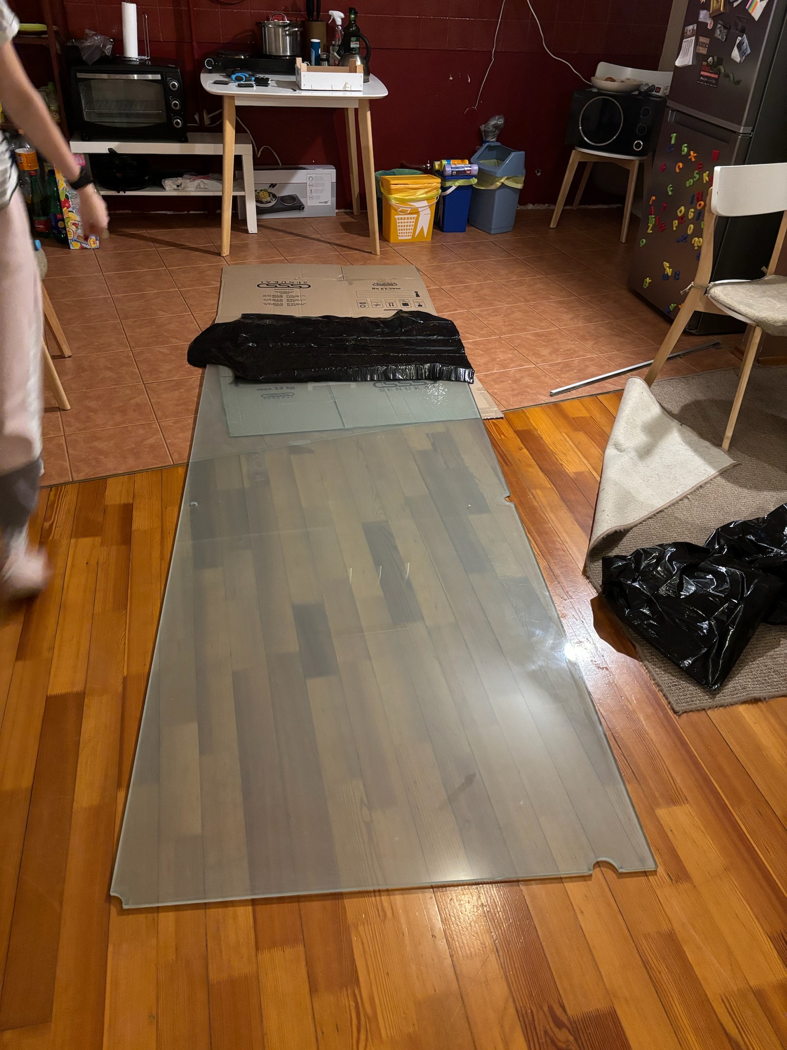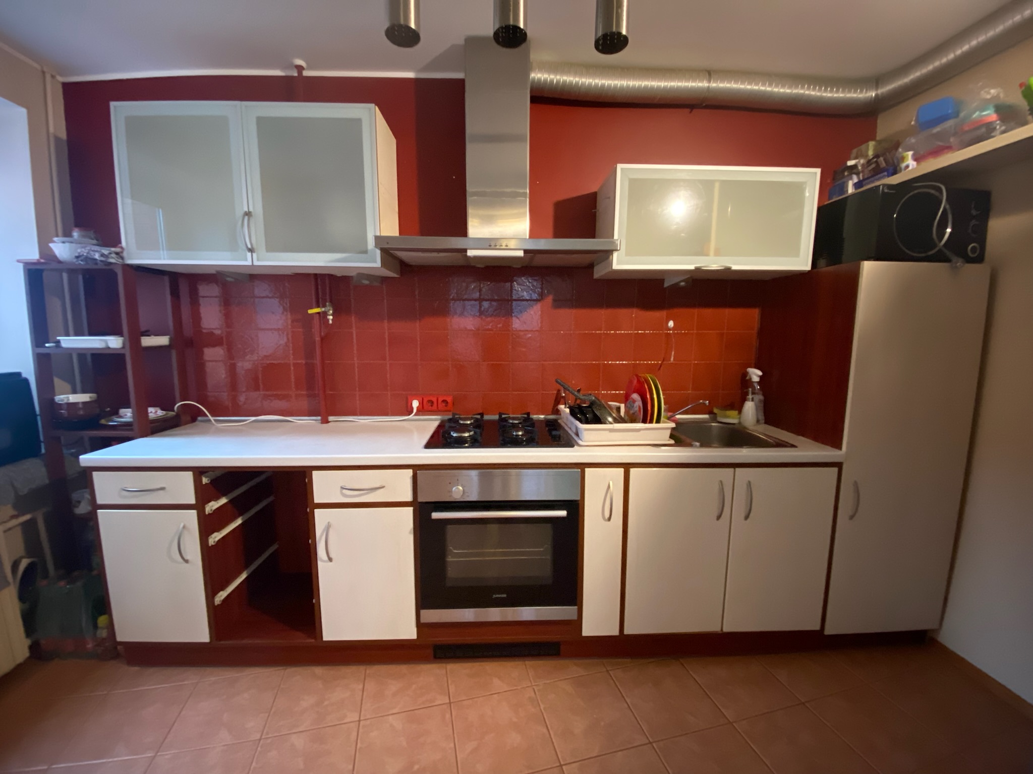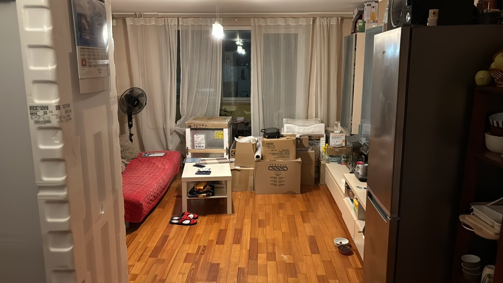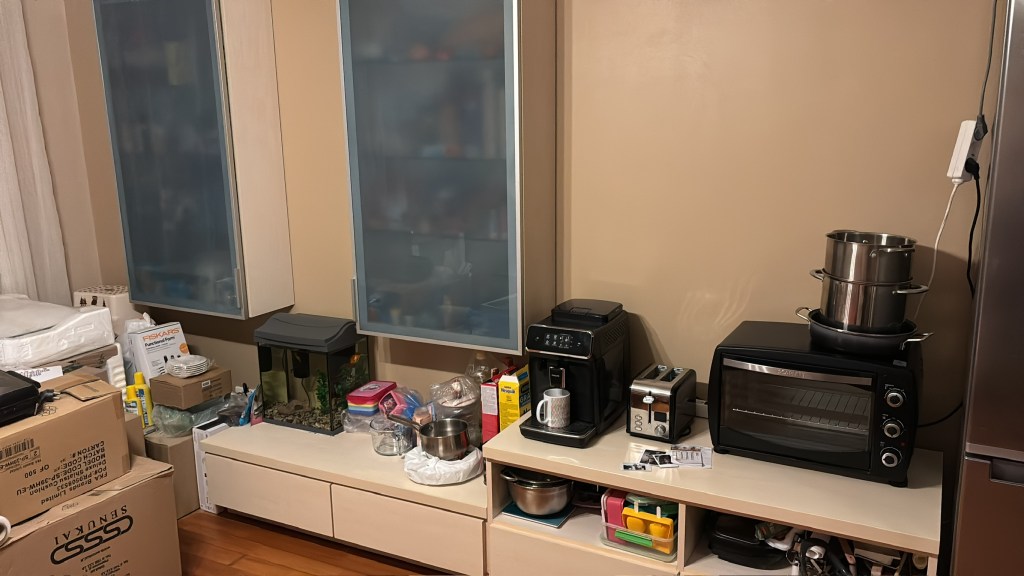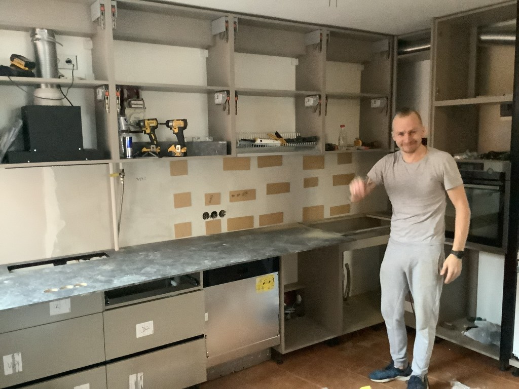 We did, in fact, start with the kitchen. Back in December we offered it for sale and got an offer. So I carefully took it all apart* and a guy came to get it. By himself. Which meant I had to help carry it down the stairs. So much for not moving. Of course, with the kitchen gone, we needed a place to prepare food until the new one arrived. I pulled out the old portable oven from our time at the Ukmerges apartment (there the oven didn’t work at all so anytime we wanted to cook something, we had to put this monstrosity on the too small countertops and put it away in the box when we were done) and we bought a new two-top electric hotplate. We started by just putting these things on the old kitchen table in the kitchen area for a few weeks, but then we needed to clear that area for the paint and electrical guys to come and do their magic before the kitchen builder could come and install all the new cabinets and appliances (which, by this point, were stacking up in our living room).