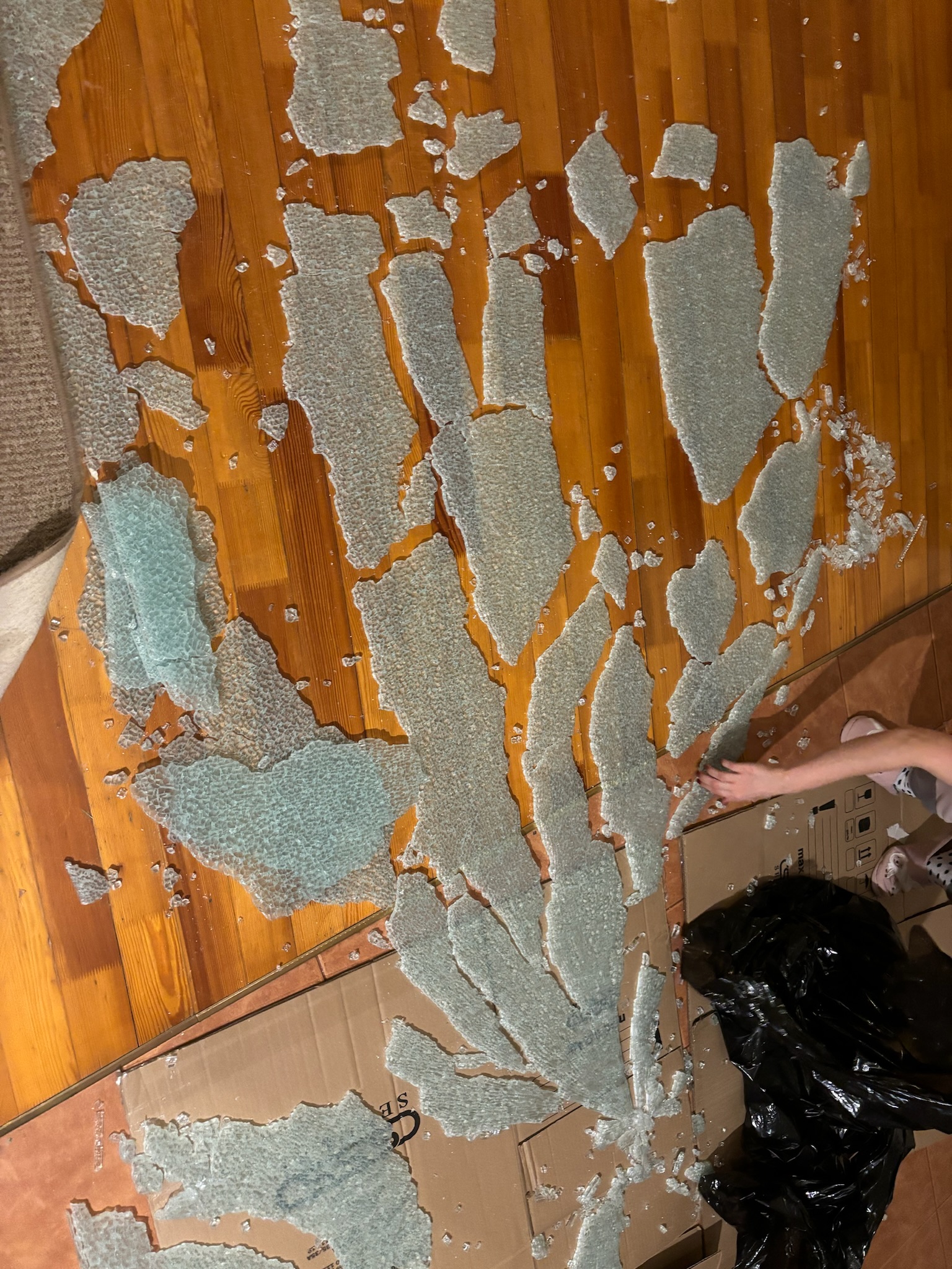 Part of the entry closet, though, was the back wall of it, which was made of a huge sheet of glass. There was also a sheet of glass separating the hall from the kitchen which I had unceremoniously shattered (we placed an ad offering them both for free to anyone who wanted to come and cart them away, and we got a taker, but by that point, only the one was left). In the original design of the closet, that sheet of glass had a fluorescent light behind it, with a switch dangling on the outside. It probably would have looked lovely when illuminated, the light diffused through the frosted glass and lighting up the living room. Unfortunately, like most of the lighting in this place, it was done rather weirdly and there was actually no way to get behind the glass to change the bulbs. I know. I tried for 4 and a half years to figure it out. This was my white whale, and it was with some great satisfaction I realized that the only way to get back there was to completely remove one of the sides of the closet. Unfortunately, I discovered this as a part of dismantling the whole damn thing.