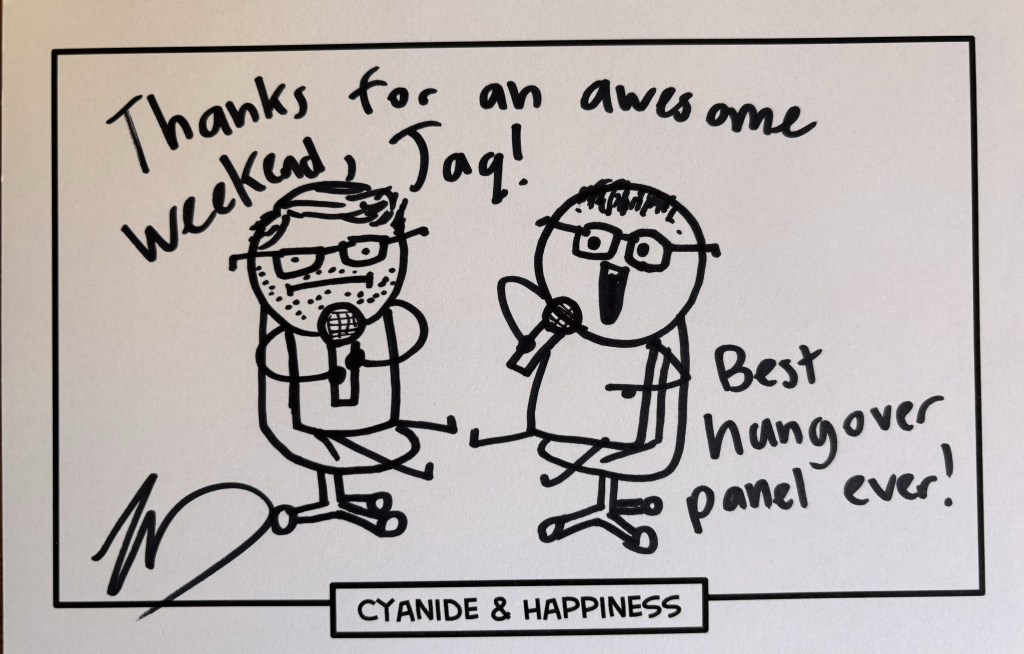 One problem I have is I don’t sleep well. Never have, really. What this means is that no matter what time I go to bed, it’s hard to sleep past 8am. Even after a delightful night out, full of laughter and imbibing, come 7am, I was up and showering and heading down for breakfast. This also meant that my first panel, with Rob from Cyanide and Happiness, was moving a little slowly. Rob decided to spice things up by giving away merch for question askers. Later, he immortalized it in a great little cartoon!