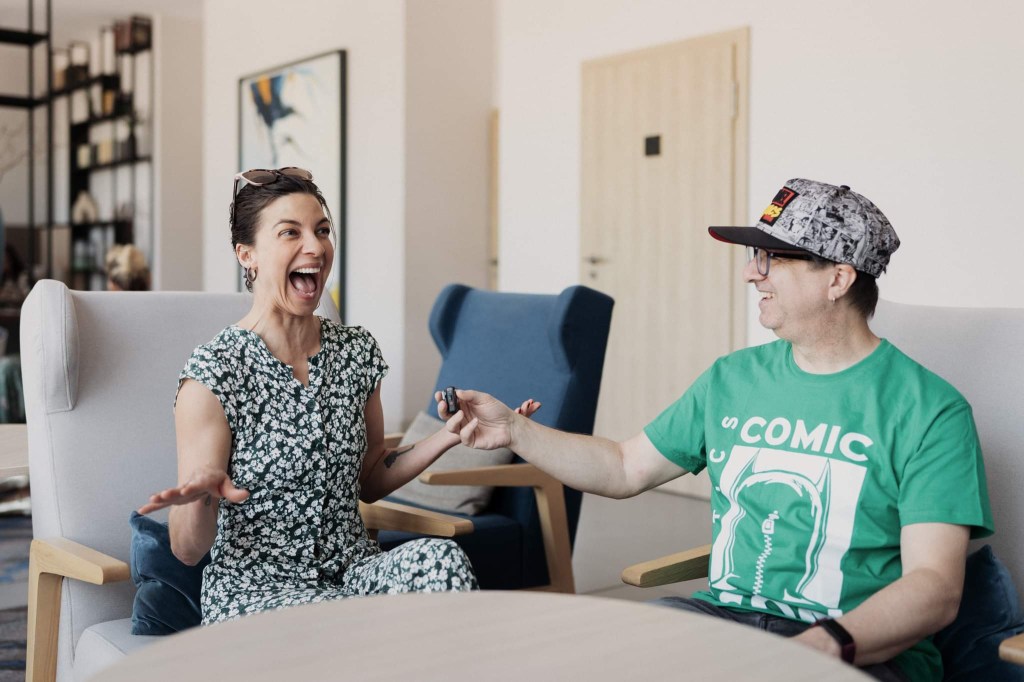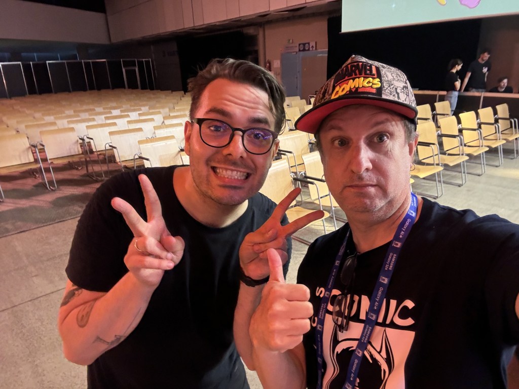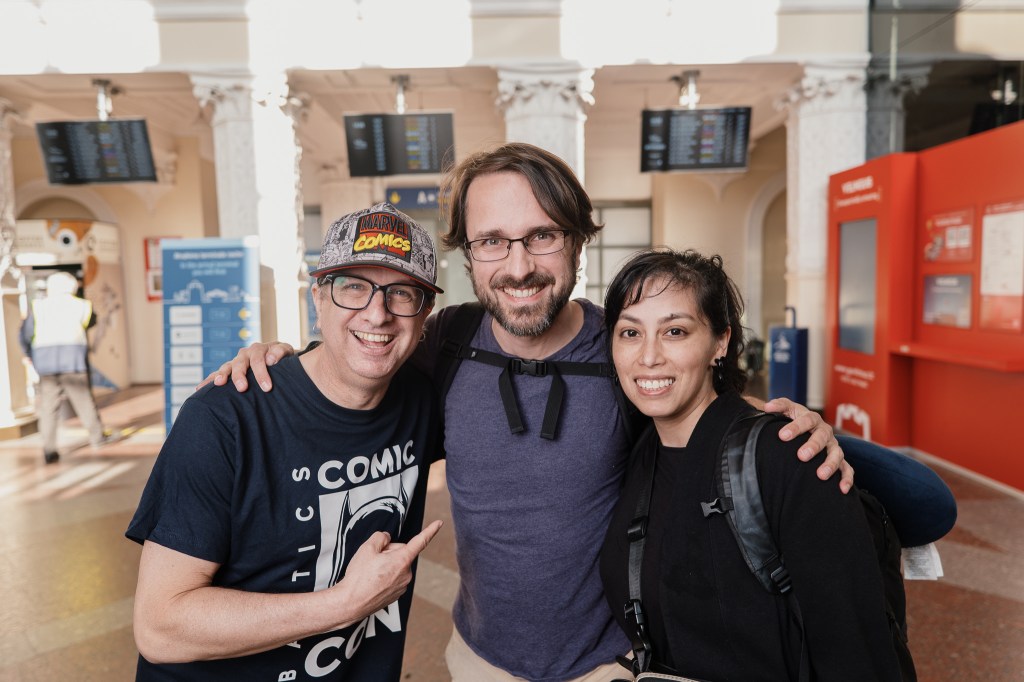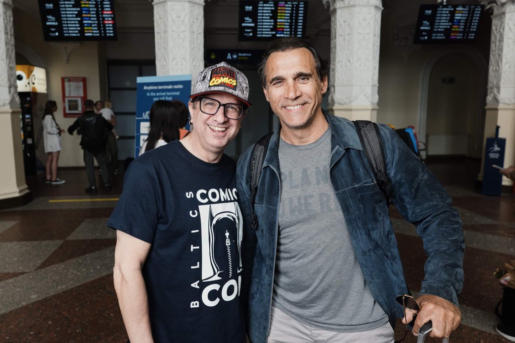 There were three scheduled pick-ups for Thursday, Sean Gunn & Natasha Halevi and Adrian Paul from the actor side and Nathan Pyle, creator of Strange Planet, and his family from the cartoonist side. Of course, as soon as we walked into Litexpo, we got the news. There was bad weather leaving Nice, so it looked like Sean & Natasha would probably not make their connection to Vilnius. It was amazing how quickly everyone mobilized to try and sort this problem. At one point, I think there were three people (me included) on the line with various airlines and airports trying to get flights held so our performers could make it.
