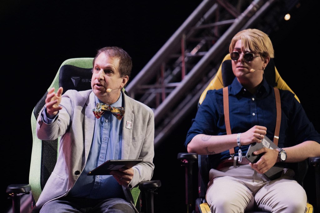 The only thing we couldn’t really practice was the guest interactions. This opening ceremony, while not unique to us, is still not a widely done thing, where all the guests appear on stage at the same time. And part of that was we wanted to do a brief interview with everyone. Last time, though, with everyone coming onstage at the same time, it became a black hole of energy. It made for a good picture, but we lost the audience. So this time, Saulė and Diana figured we should bring them out separately. First, we’d introduce the cartoonists, let them exit the stage and then bring out the performers. Of course, we’d bring them all back for a group picture, for both us and the crowd, and that seemed to work a little better. We still need something a little more energetic, but we’ll get there.