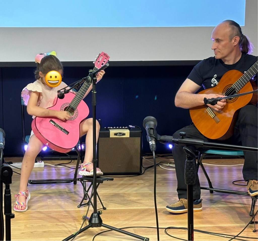 The concert was held at noon in a small performance space at the main branch of the city library. We got there at 11:30 and she had a brief rehearsal. There were only two students at her level…herself and a 20 something woman (proving there’s never a bad time to start learning something new). They were the first of the guitar players to perform and speaking as a proud, tone-deaf father, Monki nailed it. She knocked it out of the park. She played with confidence and tempo and accuracy. Both Rasa and I were holding back tears. It was so great to see her shine like that. Our neighbor Marija, who has taken on the role of local grandmother, came and brought Monki flowers.