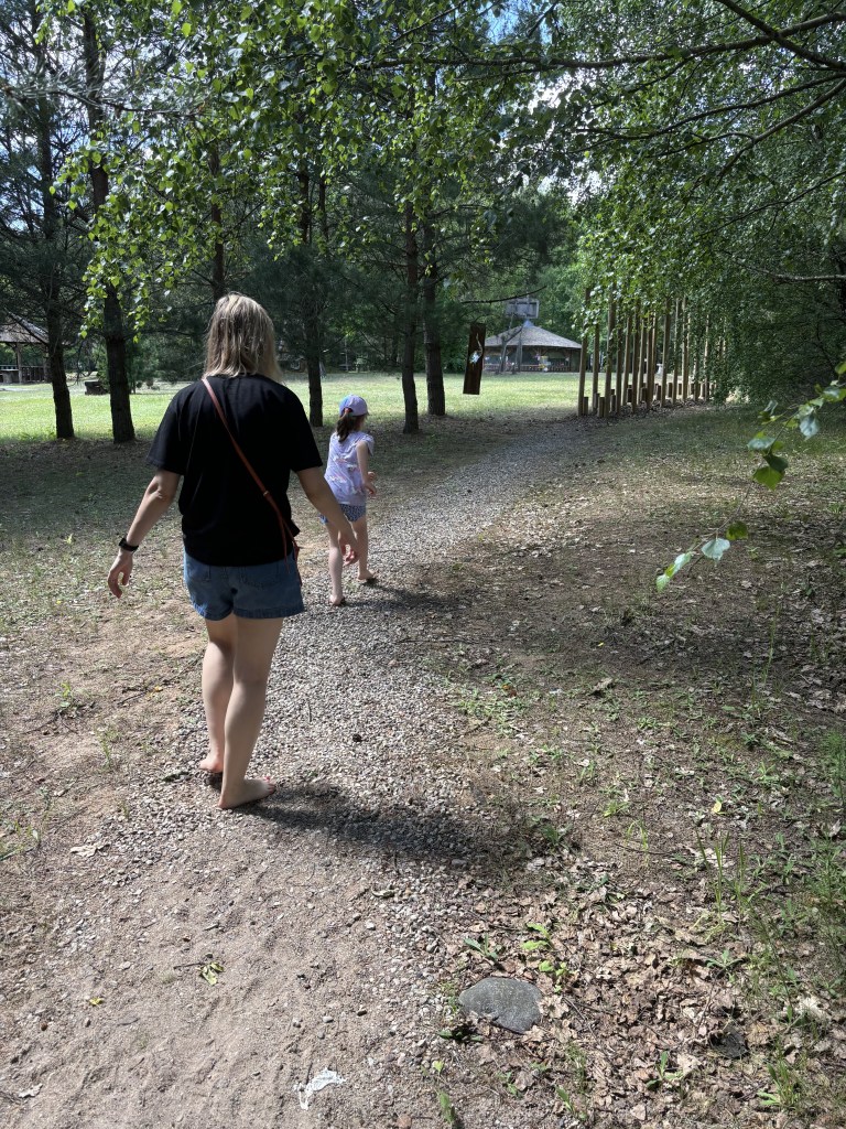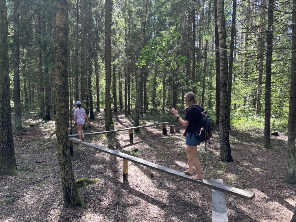 It was a beautiful day outside, she reasoned, so we should go out to nature and do something. One of the things she’d always wanted to try was a barefoot walking trail. Evidently this was a thing. The idea was you walk through the woods barefoot, and along the trail there are all sorts of sensory things to step on/over/through. Luckily, it turned out there was one about 20km away from Kaunas, in the Lithuanian village of Switzerland.