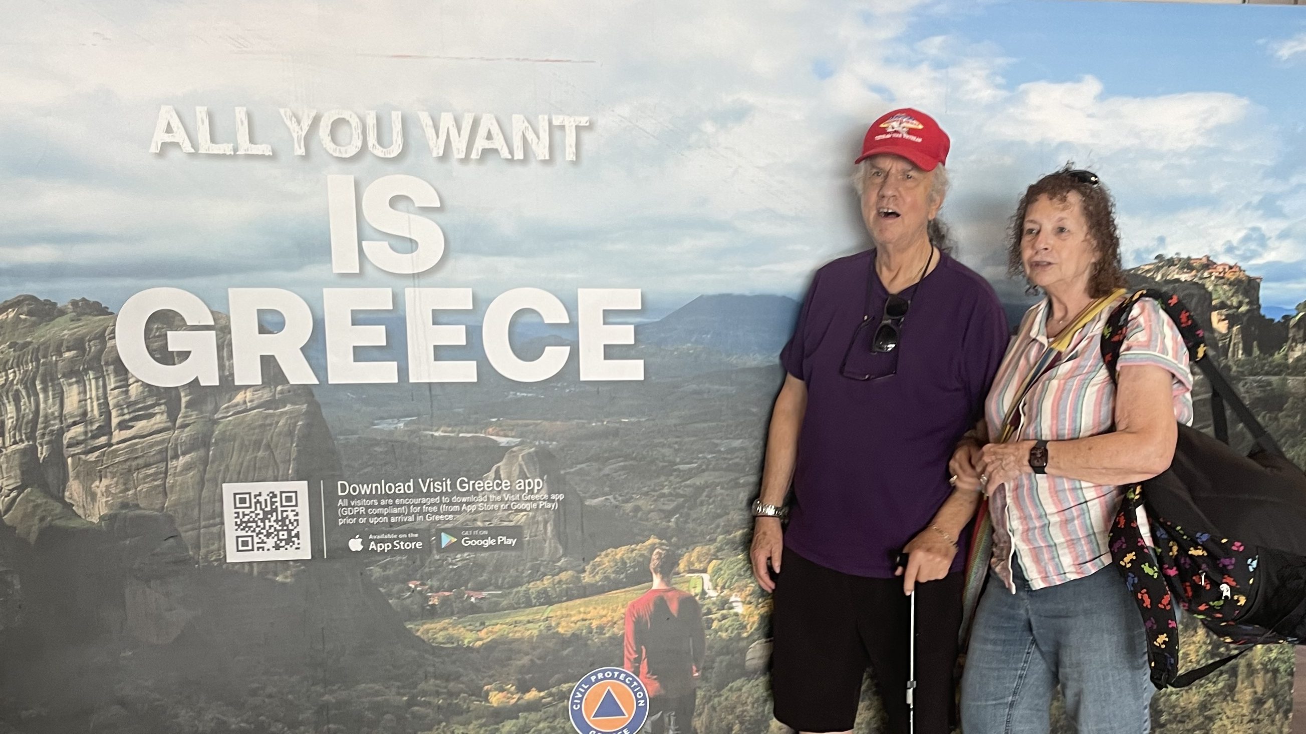 We walked down the hill to the main street to see what we could see. We had seen the pick up spot for the train so we knew where that was, but we didn’t know anything else. There was an excursion counter1 across the street so we went over there to ask. We could also ask about various other day trips we’d been thinking about. For instance, there was a 1 or 2 day trip to Santorini (you know, the famous blue and white houses you see in all the travel brochures) or various day cruises. There was also the one trip we were already looking at, so we were able to ask questions about what that might entail. And we were able to buy tickets for the train tour, which we did.