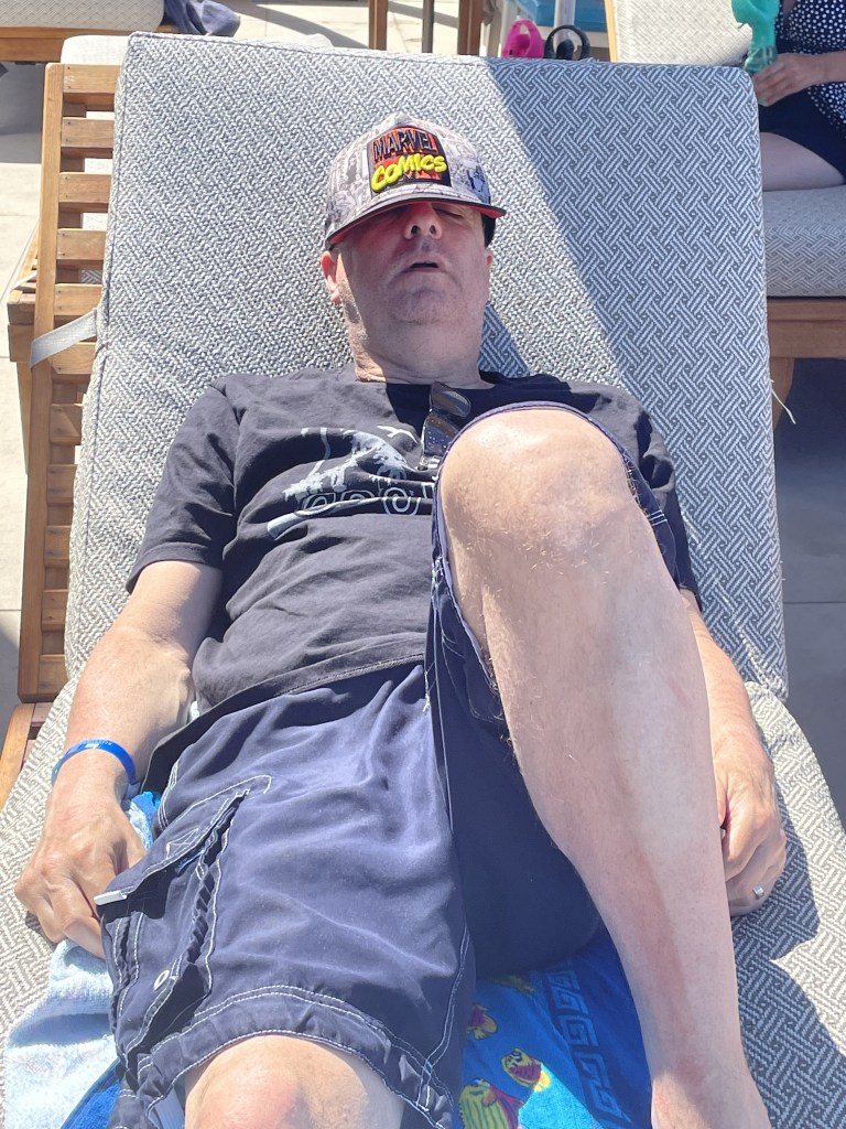 With food in our tummies, we were back at the pool. We’d left something on our two chairs to mark them as occupied so at least we didn’t have to scramble to find a place to sit. Monki decided it was time to really learn to swim so the floaties were left off and she committed to keeping herself afloat. It was great! She was swimming and I was next to her to make sure it all went okay.