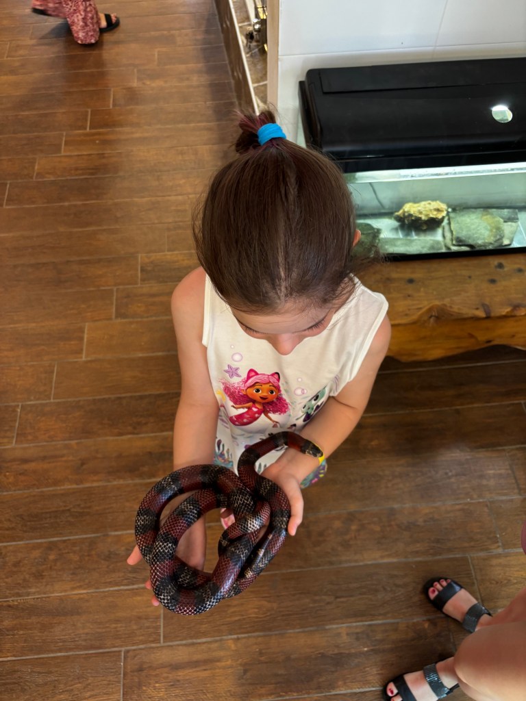 Before leaving we grabbed a tourist map of the area and examined it over ice cream in the attached snack shop. There were a couple of nearby things to see, one of which sounded the most cool – Reptisland. At first we passed right by it, but then doubled back and went inside. It was basically just a large, single room with a lot of lizards and snakes and things in tanks. But then the guy who owned and ran the place, took a snake out of a cage, handed it to me, and went on to talk to some other folks. For the hour or so we were there, that’s how it was. He would just hand off animals, exchanging them with animals other people had been petting, answering questions and giving mini-lectures about whatever you were holding. At times, we traded with other people who were visiting. It was fun and surreal and Rasa even held a few critters!