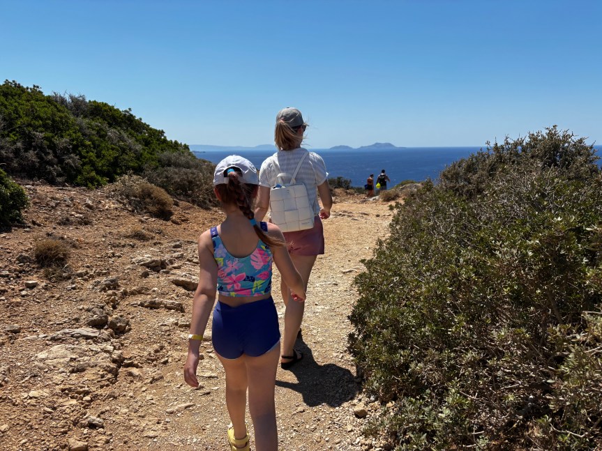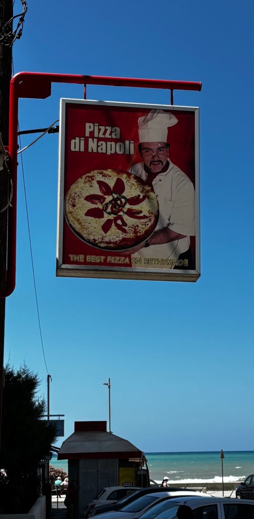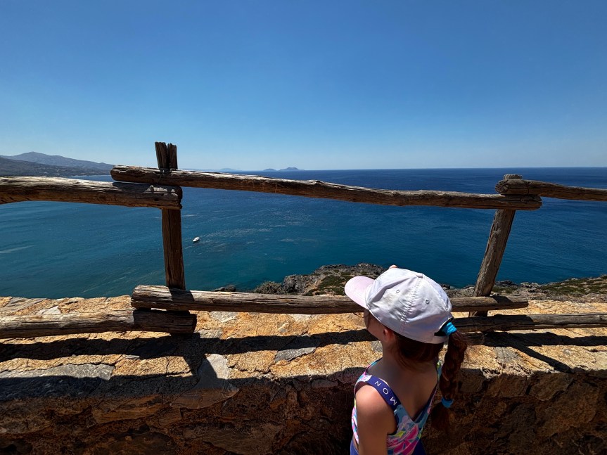 We didn’t stop at the honey museum on the way out of that area since we were hungry, opting instead to try and find a lunch spot in the nearby larger town of Rethymno. Ultimately, we found a lovely pizzeria close to the beach and Monki was very excited when the grandpa who was our server called her a princess. We had a delicious pizza and all ordered specialty, fruit-based drinks. Of course, they were delivered while I was in the toilet so by the time I returned, the girls had tasted theirs and various swaps were made. I’m not sure what I ended up with, but it certainly wasn’t what I ordered. But they all had plastic monkeys so it was okay.