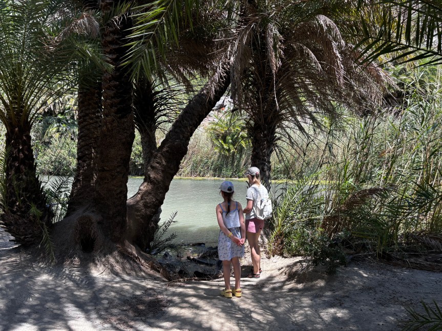That place turned out to be a taverna called Gefyra, home to a really old bridge. It was also on the same river we had just left, the one which flowed through the palm forest, and we crossed to get to the heart-shaped rock. So technically, we could have walked there, but we’re pretty glad we didn’t. They did have ice cream and some delicious fruit smoothies, so our obligation was completed. We even asked our server about the severity of the walk to the Big Waterfall. We were told it was an easy 200 meters or something. Okay then, we were off to try it.