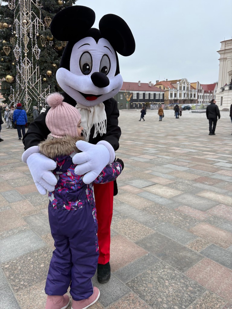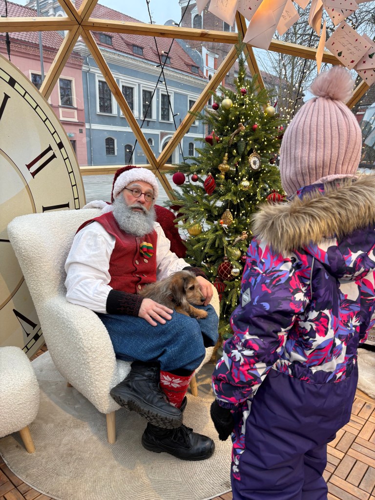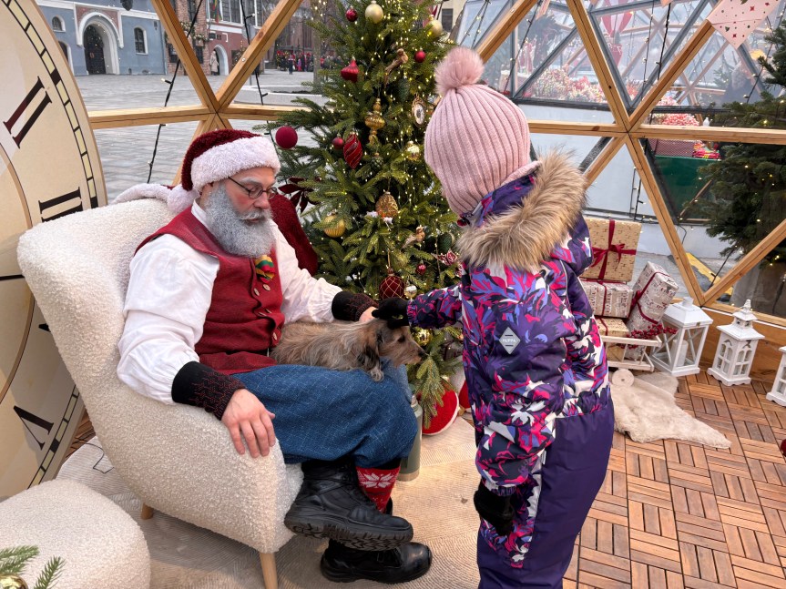 As we got closer, we could see Santa inside. It was the same Santa we’d met last year. Evidently, he’s the “official” Santa for Lithuania and last year, he was wonderful. Very energetic and jovial. This year, we could see a dog with him, sitting on his lap, and Monki was very excited.